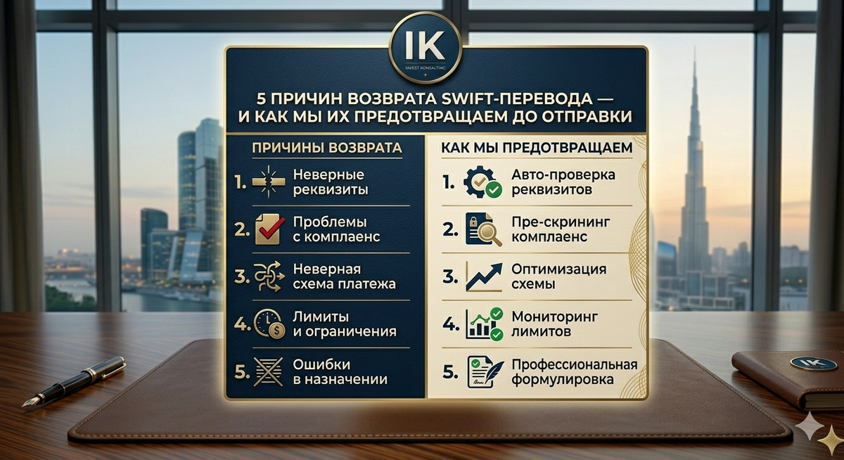Почему деньги возвращаются, вместо того чтобы дойти — и что с этим делать Вы отправили перевод в ОАЭ. Прошло 3–5 дней. И вдруг — деньги вернулись с непонятной пометкой банка-корреспондента. Потеря на конвертации, банковские комиссии за возврат, нервы и потерянное время. Это не редкость. Это стандартная история 2024–2025 года для тех, кто пробует отправить средства из России в ОАЭ, Турцию или другие юрисдикции самостоятельно — через оставшиеся SWIFT-цепочки. Ниже — пять главных причин, по которым переводы возвращаются. И краткое объяснение, как мы устраняем каждую из них ещё до того, как перевод ушёл. Банки ОАЭ крайне чувствительны к расхождениям. Одна буква в имени, несоответствие IBAN, отсутствие BIC/SWIFT-кода банка-посредника — всё это автоматический возврат. Особенно если получатель — физическое лицо. Что важно знать: реквизиты эмиратского банка для перевода из России имеют свою специфику. Мы всегда верифицируем IBAN и SWIFT-реквизиты банка ОАЭ у получателя до отправки — отдельным