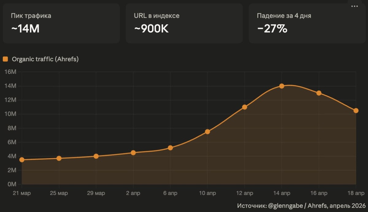 AI" нового поколения: как сайт с ИИ-контентом захватил Google — и рухнул Очередной случай массового SEO-манипулирования через ИИ зафиксировал SEO-аналитик Гленн Гейб. Один из сайтов очередных самых умных предпринимателей-маркетологов сгенерировал почти 900 000 URL-адресов с ИИ-написанными новостями, разбитыми по городам, и добился попадания в ключевые поверхности Google: Top Stories, Google News, вкладку «Новости» в поиске и, вероятно, Discover. Обнаружила схему журналистская статья – именно она привлекла внимание Google. После этого трафик резко пошёл вниз.