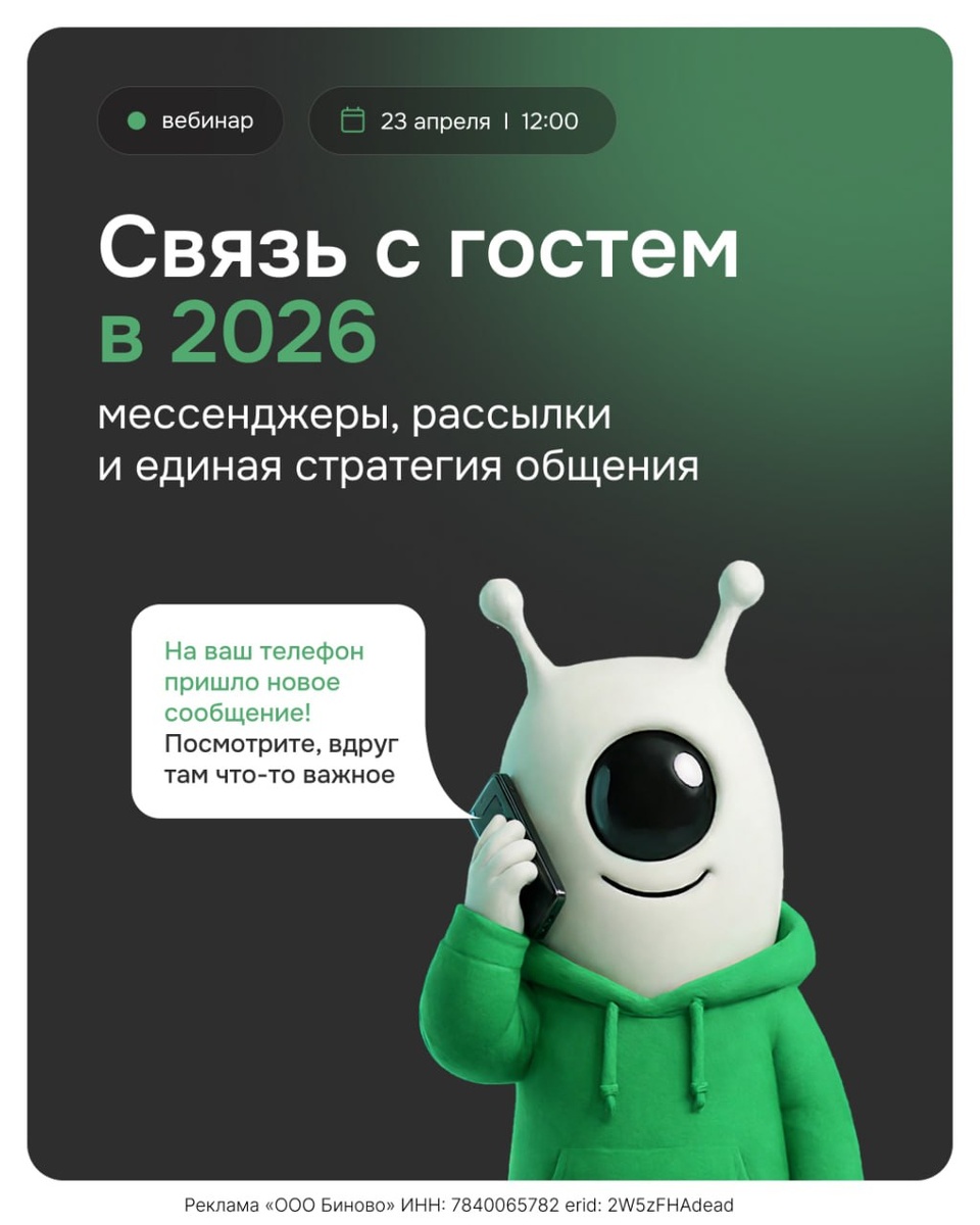 ? Коммуникация с гостями влияет на расходы и загрузку: каждое сообщение — это время, деньги и шанс довести бронь до заезда. Но как быть, когда SMS дорожают, гости пишут в разные каналы, вы не успеваете ответить, а сообщения теряются из-за нестабильной связи и блокировок мессенджеров? 23 апреля Bnovo проведет вебинар о коммуникации с гостями в 2026 году. 🎤Спикер — Катерина Вербицкая, директор по маркетингу платформы для автоматизации общения с клиентами Imobis. Разберут: ⭐️ снижение расходов на коммуникации ⭐️ построение своей системы каналов связи ⭐️ автоматизацию ответов и уведомлений ⭐️ использование переписки для роста дохода 📆 23 апреля | 12:00 мск Снизьте расходы на коммуникации и начните зарабатывать на чатах с гостями! 👉 Занять место