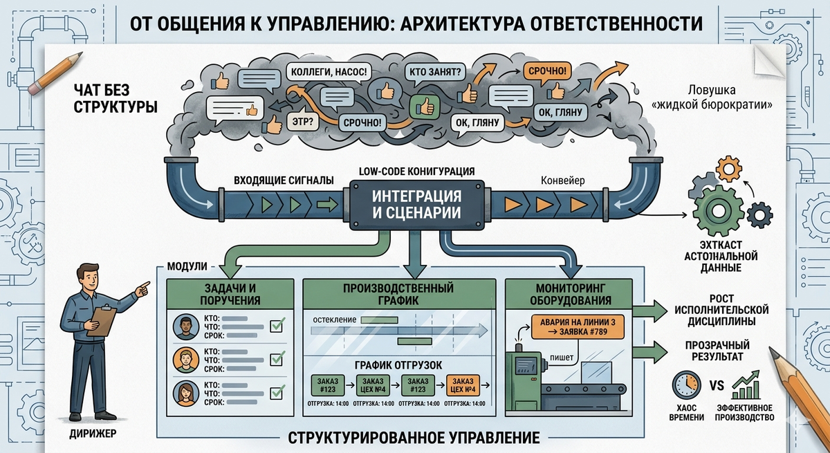 Как превратить поток сообщений в прозрачный график отгрузок через связку модулей общения и задач. Скорость набора текста не имеет ничего общего со скоростью отгрузки продукции. Это главный вывод, который стоит сделать перед внедрением любого корпоративного мессенджера. Ошибка большинства руководителей заключается в убеждении, что если сотрудники стали отвечать друг другу за три секунды, то и рабочие процессы ускорились в разы. На деле же бесконечные уведомления часто создают «иллюзию деятельности», за которой скрывается полная потеря ответственности за конечный результат. Ловушка «жидкой бюрократии» Раньше распоряжение фиксировалось на бумаге или в строгом электронном письме. Это было медленно, но надежно: был понятен отправитель, поручение и срок. Корпоративный чат превратил управление в «жидкую субстанцию». Когда задача ставится фразой «Коллеги, надо бы разобраться с насосом» в общем канале на 50 человек, она мгновенно растворяется. В системной инженерии есть понятие состояния систе