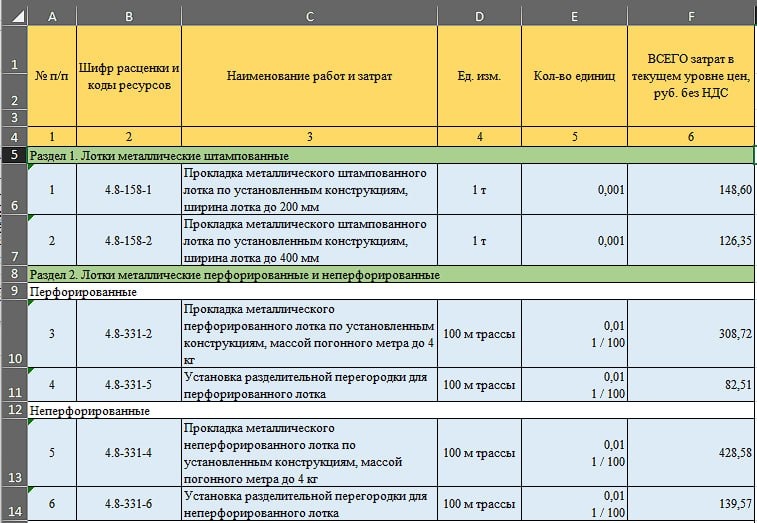 Дополнение 1-81 к ТСН-2001, вышедшее в конце марта, добавило много интересных сметных норм на монтаж лотков. В рамках давней рубрики "практик ТСН", попробую систематизировать новые расценки и определить ориентировочную стоимость в текущем уровне цен. 1. Теперь в 4.8 пять видов лотков: - лотки металлические штампованные (4.8-158-1 и 4.8-158-2); - лотки металлически перфорированные (4.8-331-2 и 4.8-331-5); - лотки металлически неперфорированные (4.8-331-4 и 4.8-331-6); - лотки металлические сетчатые (4.8-336-1 - 4.8-336-3); - лотки металлические лестничные (4.8-337-1 и 4.8-337-2); - конструкции для крепления штампованных лотков (4.8-83-4 - 4.8-83-15); - конструкции для крепления перфорированных и неперфорированных лотков (4.8-331-10 - 4.8-331-12, 4.8-331-15). 2. Значительно дополнена 1 глава с электроустановочными материалами для лотков. Делая коммерческий объект, мы полностью закрыли "по базе" все лотки, так как номенклатура и выбор стали очень богатыми (спасибо НИАЦ). 3. Изменен