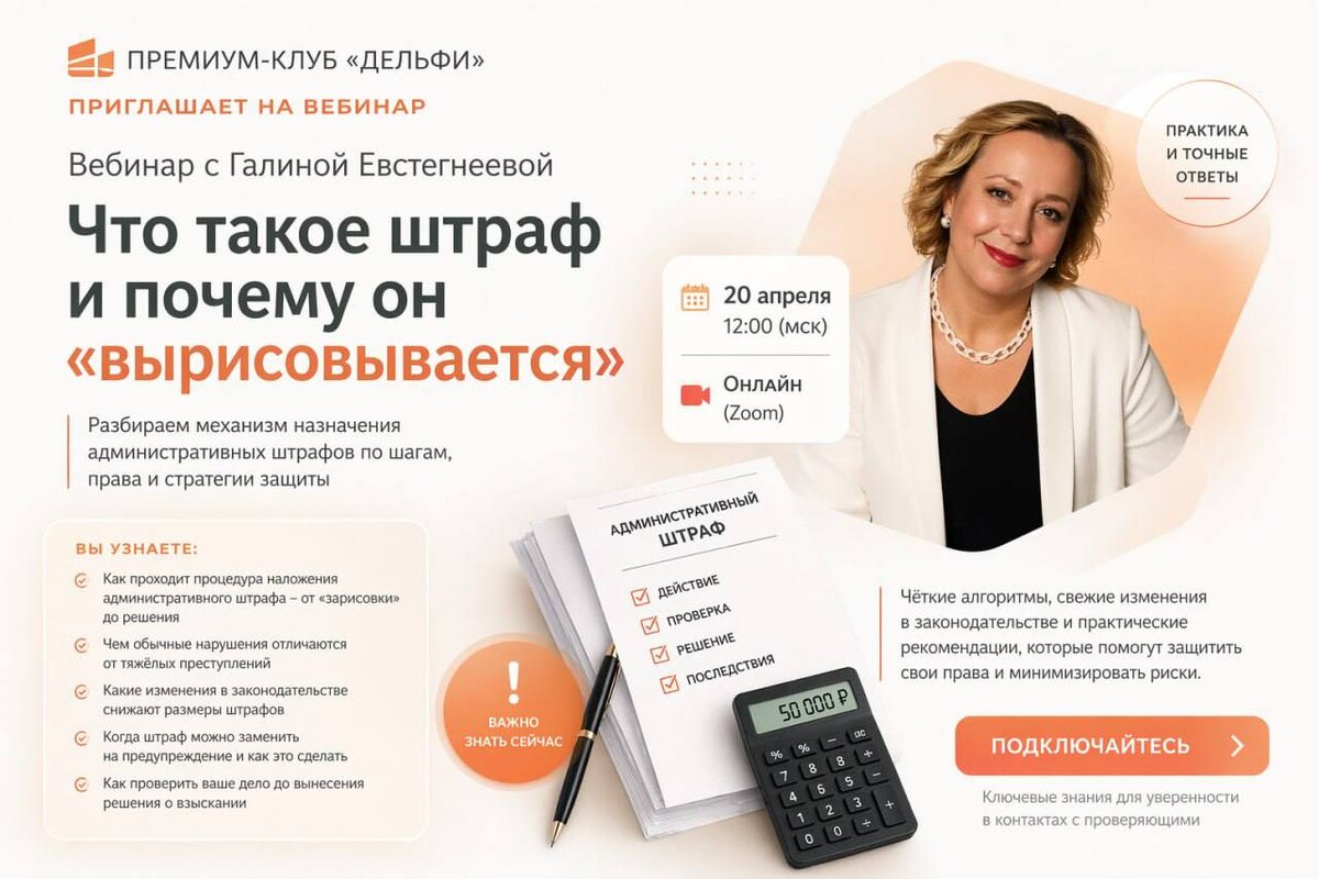 … Разбираем, как штраф «вырисовывается» от начала до финального документа 20 апреля | 12:00 МСК На закрытой встрече Премиум-клуба «Дельфи» эксперт Галина Евстегнеева шаг за шагом разберёт, как возникает и оформляется административный штраф. Что будет в фокусе: — как происходит та самая «зарисовка» — первый этап фиксации нарушения; — как формируется окончательный документ, фиксирующий правонарушение; — где находятся точки влияния и защиты на каждом этапе; — как проверить дело до вынесения решения о взыскании. Формат: закрытая встреча в рамках подписки Премиум-клуба. 📌 Со всеми мероприятиями подписки вы можете ознакомиться по ссылке: https://delfi-law.ru/activity Присоединяйтесь.