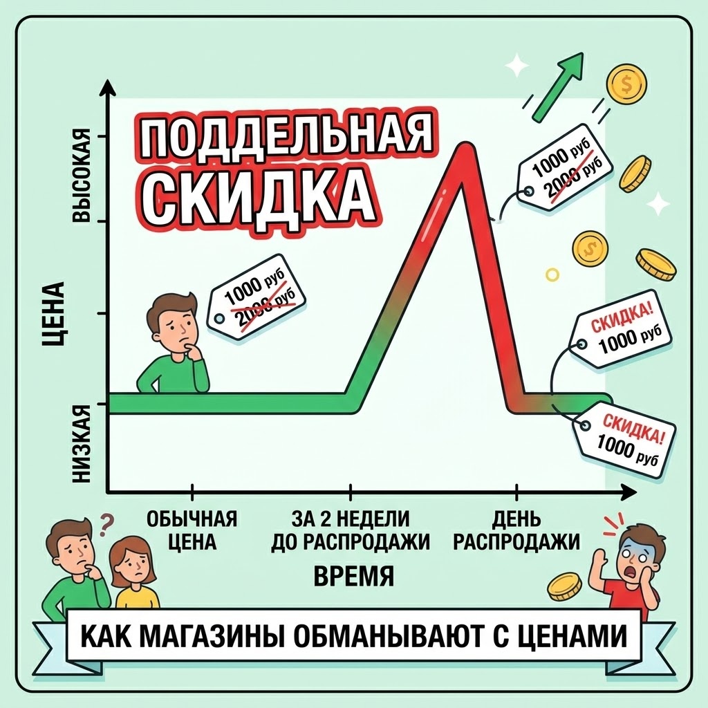 Большие распродажи на маркетплейсах - это всегда ажиотаж. Яркие баннеры, зачёркнутые цены, таймеры обратного отсчёта. Кажется, что если не купить прямо сейчас - упустишь выгоду. Именно на этом и строится манипуляция. В этой статье я помогу разобраться, как отличить реальную скидку от красивой картинки. Что такое накрученная «старая цена»↗ Схема простая. Продавец берёт товар, который обычно стоит, например, 2000 рублей, и за две недели до распродажи поднимает цену до 4000. В день акции возвращает обратно к 2000 и пишет «скидка 50%». Покупатель видит большую красную цифру и думает, что экономит половину. На деле он платит ровно столько, сколько всегда. Это не редкость - это массовая практика на всех крупных маркетплейсах. Особенно активно такие схемы используются перед Чёрной пятницей, 11.11, Новым годом и другими крупными акциями. Платформы формально борются с этим, но полностью победить не могут: продавцов слишком много, а правила легко обойти. Как распознать настоящую скидку ✅ Посмотр