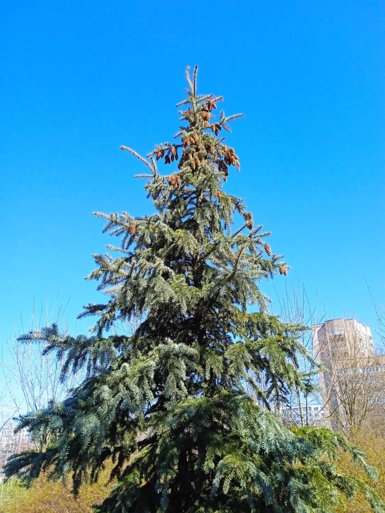 Вот стоят красивые ели, а на самой макушке висят шишки. Внизу шишек нет, их все оборвали. Я видела не сегодня, а раньше людей с огромными еловыми лапами, а на них шишки и не перед новым годом.