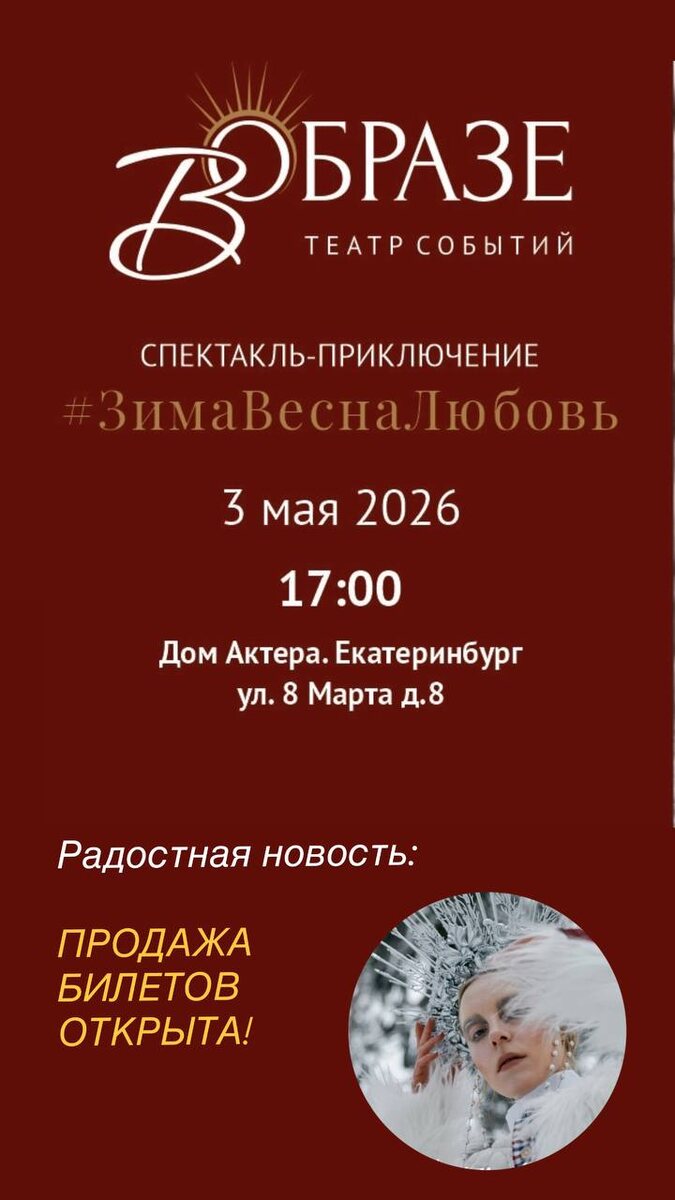 ! Мы с нетерпением жду 3 мая, когда на сцене ДОМА АКТЕРОВ состоится премьера нашего спектакля ПРО ЛЮБОВЬ ☘️ Это настоящая театральная постановка, полная эмоций и ярких моментов. Мы усердно репетируем, стремясь подарить вам незабываемый вечер ☘️ ☘️☘️☘️☘️☘️☘️☘️☘️☘️ ☘️ ☘️☘️☘️☘️☘️ И вот радостная новость: ПРОДАЖА БИЛЕТОВ НА СПЕКТАКЛЬ ОТКРЫТА! Лучшие места в первых рядах можно приобрести написав мне в личные сообщения. ☘️ Стоимость всего 1000р. Вас ждет два часа захватывающего зрелища, которое никого не оставит равнодушным. Приходите посмотреть спектакль и увидеть меня на сцене! Буду очень рада видеть вас среди зрителей. Уверена, этот вечер подарит вам массу положительных эмоций и приятных впечатлений. До встречи в театре! 🎭