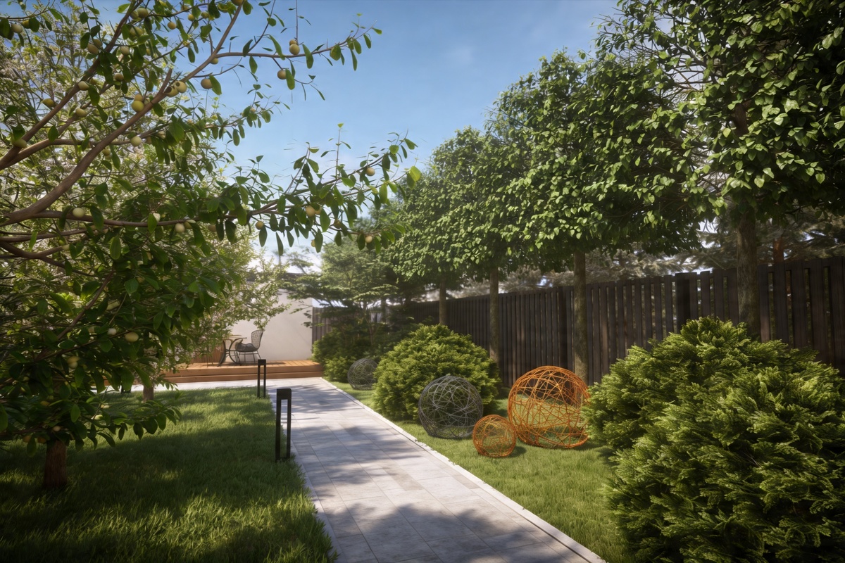 Такой подход позволяет создать ощущение уединения даже на участке, который формально остаётся открытым.