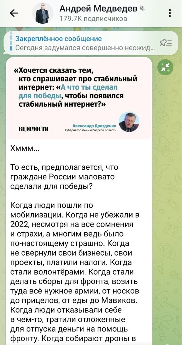 Депутат Госдумы Евгений Фёдоров прокомментировал публикацию журналиста Андрея Медведева о том, что россияне уже сделали достаточно для победы и вправе задавать вопросы. «Интересная дискуссия! Конечно, люди молодцы, но для получения победы нужна функция людей как части "единственного источника власти, народа", принять решение об отмене народом своего решения 1991-93гг по предательству Отечества, и принять сейчас решение по восстановлению суверенитета. А он, Народ, пока это решение принять не хочет. И автору поста такое решение то же не нужно. Отсюда и наезд на губернатора Дрозденко, который сказал правильные вещи», — написал политик. Депутат Фёдоров напомнил слова Вышинского на процессах против шпионов 30х годов: «Они прячутся под маской патриотизма, и при этом организуют поражение СССР в войне, а нам нужна не демагогия, замаскированная под патриотизм, нам нужна Победа и восстановление Отечества». @belrusinfo