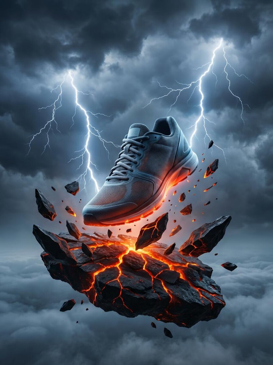 👟⚡️ Если вы продаете обувь или одежду на маркетплейсах, вы знаете: обычные фото на белом фоне больше не работают. Чтобы товар кликали, нужна динамика, эпичность и графика. Раньше для создания постера, где кроссовок парит над раскаленной лавой под ударами молний, нужно было нанимать 3D-дизайнера за десятки тысяч рублей. Сегодня агрегатор Yodiz делает это бесплатно за 15 секунд. Оцените этот невероятный кадр, сгенерированный в модели Nano Banana Pro. Чтобы нейросеть выдала такую эпику, мы использовали мощный кинематографичный промпт: "Динамичный и мощный кадр... кроссовок, который кажется висит в воздухе над массивным, парящим в небе куском расколотой лавы и острых черных камней. Вся сцена залита драматическим холодным светом, исходящим от двух ярких молний... Свет молний создает яркие блики на поверхности обуви и подчеркивает драматичность композиции..." Обратите внимание на детализацию: нейросеть идеально прорисовала сетчатую ткань и мягкую резину подошвы, совместив это с фантастич