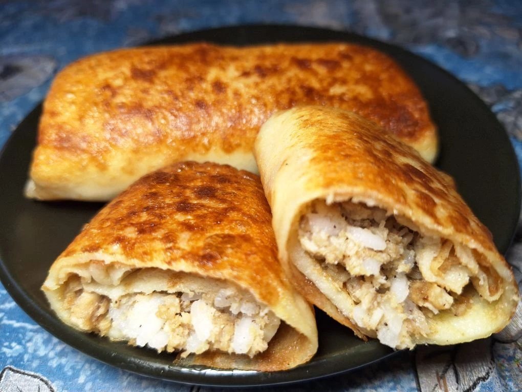 Тесто еще раз хорошо перемешать, выпечь тонкие блинчики. Затем начинить начинкой, примерно по 1 ст.л. или чуть больше.