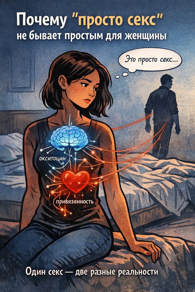 Они лежат в одной постели. Делали одно и то же. Но их внутренняя химия говорит на разных языках. Мужчина может иметь секс без обязательств и реально не привязаться. Потому что его биология позволяет. Женщина - нет.