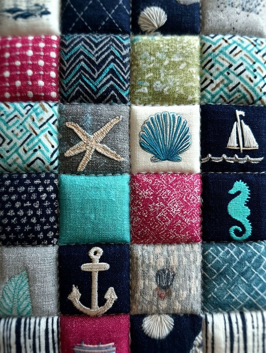 are stitched into a uniform grid across the entire surface each patch features a unique design blending geometric patterns and marine themed artwork some deep navy blue patches hold bright turquoise starfish white nautical anchors detailed seashell illustrations and stylized white boats with light brown wooden details some soft mint green patches display light and dark green chevron zigzag patterns fine linear textures and subtle small ocean inspired motifs some light gray patches feature crisp white polka dots thin vertical stripes and textured woven style details some bright white patches include detailed blue seahorse illustrations delicate gray linework and faint seashell patterns other patches showcase bold black and white chevron patterns nautical rope inspired stripes and intricate repeating marine line art the patches alternate in a consistent repeating pattern across the entire surface creating a charming playful rustic coastal aesthetic --chaos 50 --ar 3:4 --stylize 300 #Ней