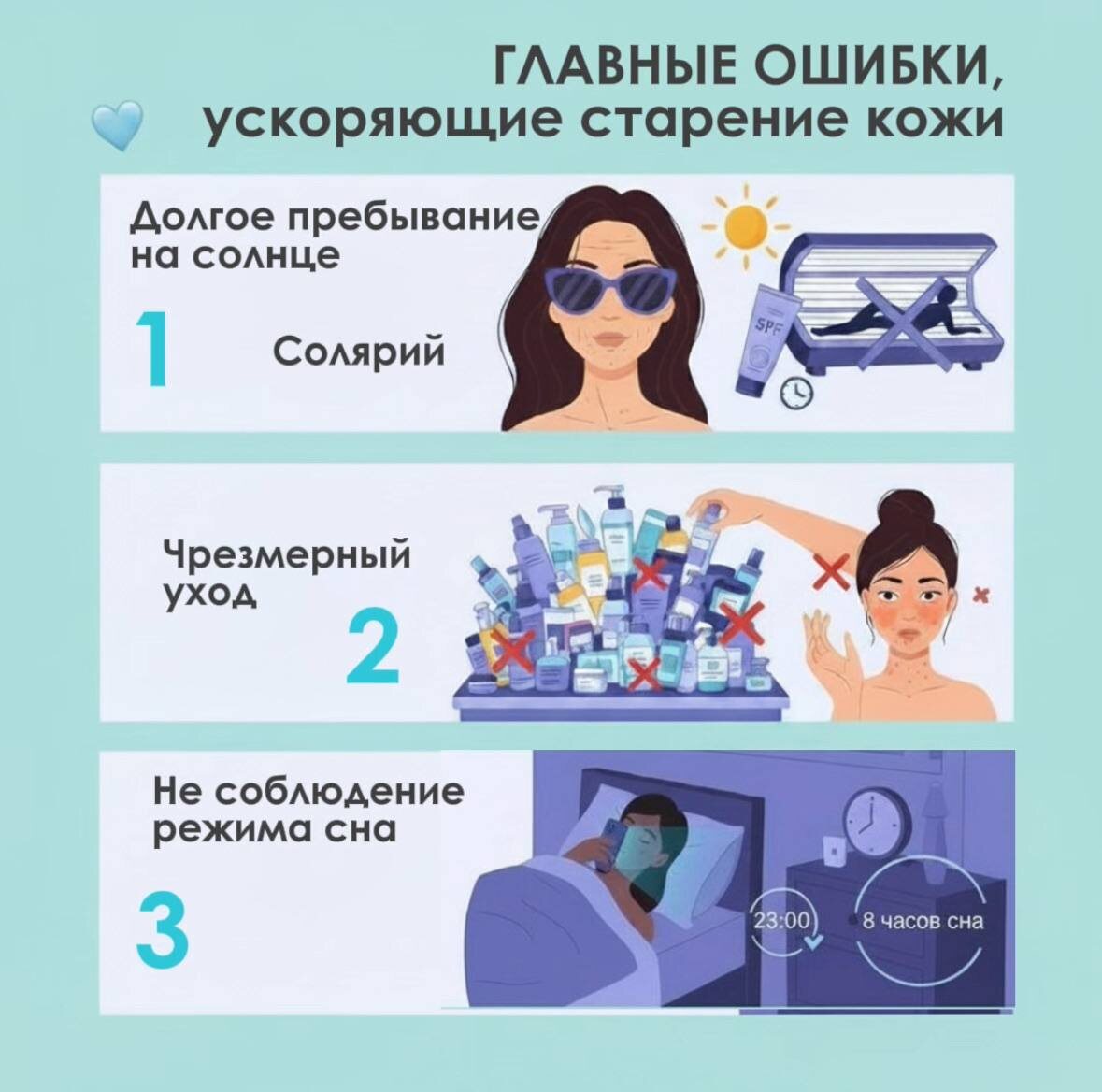 Мы часто ищем «волшебную таблетку» от морщин, забывая, что молодость кожи напрямую зависит от наших базовых привычек. 3 главные ошибки, которые ежедневно крадут ресурс Вашей кожи: ☀️ 1. Фотостарение и пренебрежение SPF Загар — это не признак здоровья, а защитная реакция кожи на повреждение клеток ультрафиолетом. УФ-лучи разрушают коллаген, провоцируют стойкую пигментацию, обезвоживание и повышают риск новообразований. Лучше полностью исключить солярий. Наносите SPF-защиту на лицо, шею и декольте ежедневно, обновляя её каждые 2–3 часа при активном солнце. 🧪 2. Профицит ухода Правило «чем больше, тем лучше» в уходе за лицом не работает. Обилие баночек, частое использование пилингов и наслаивание конфликтующих активов разрушают липидный барьер. Как итог: кожа становится реактивной, появляются шелушения, высыпания и микровоспаления, которые ускоряют старение. Используйте активные компоненты соблюдая рекомендации, не перегружайте кожу и всегда следите за восстановлением защитного барьер