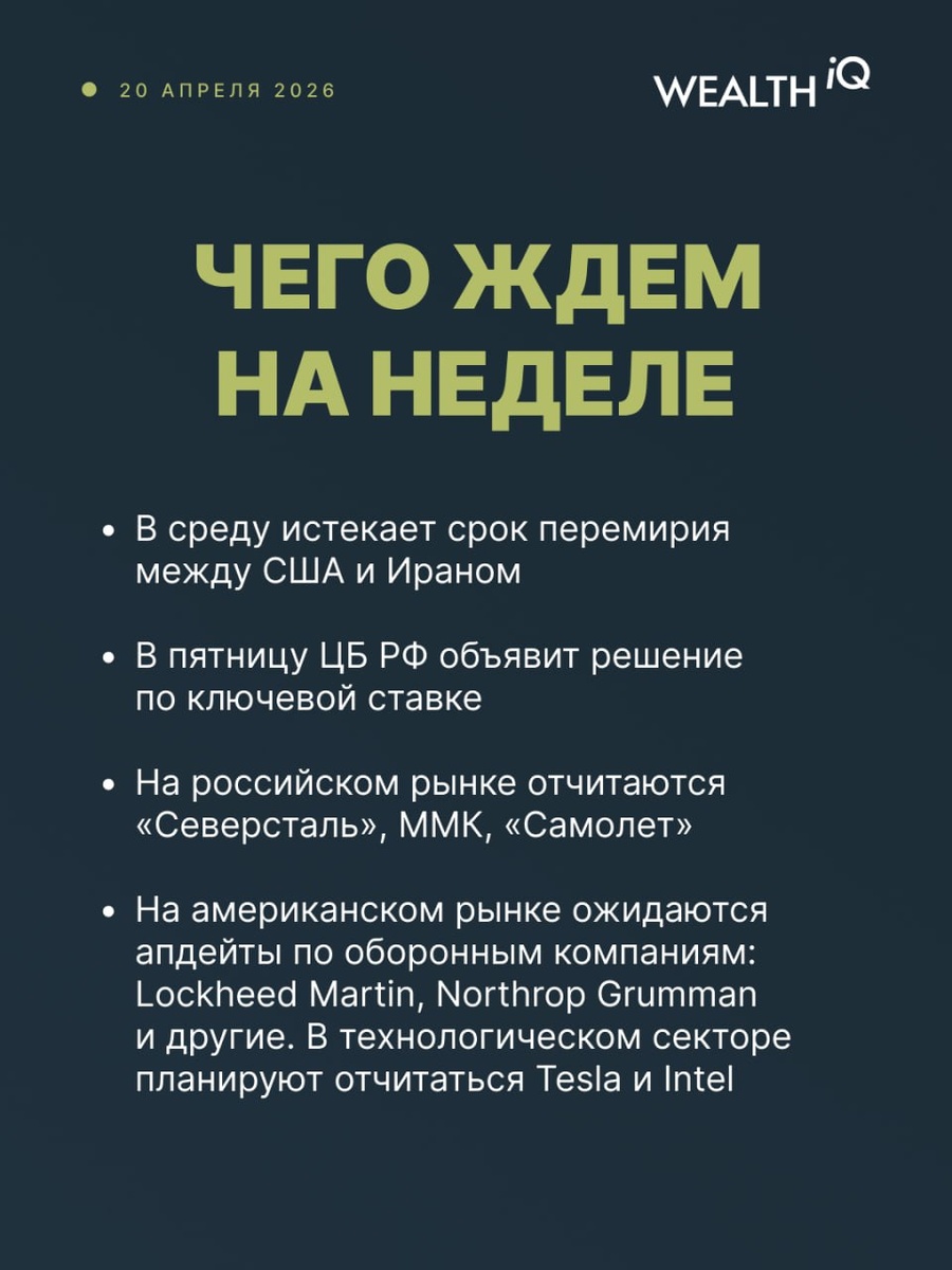 🇷🇺Россия: заседание ЦБ В пятницу состоится заседание Банка России. По нашему мнению, ключевая ставка может быть снижена на 50-100 б. п. до 14-14,5%. В среду Росстат представит данные по инфляции за неделю с окончанием 20 апреля. Из корпоративных событий: во вторник операционные и финансовые результаты за первый квартал 2026 года представит «Северсталь», в четверг — ММК. В пятницу «Самолет» опубликует отчетность за 2025 год. 🇺🇸США: дедлайн по перемирию между США и Ираном, отчетность Tesla В среду истекает срок перемирия между США и Ираном. Отсутствие прогресса в переговорах угрожает возобновлением боевых действий. Обе стороны обвиняют друг друга в нарушении условий перемирия. В рамках сезона корпоративной отчетности на этой неделе ожидаются апдейты по оборонным компаниям. В центре внимания будут Lockheed Martin, Northrop Grumman и другие. В технологическом секторе планируют отчитаться Tesla и Intel. Интересным политическим событием может стать выступление перед сенатом кандидат