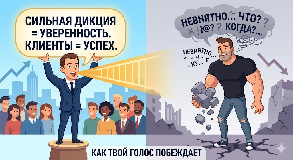 Мы привыкли думать, что сила — это мышцы, деньги или статус. Но в реальности миром правят те, кого слышно. Бывало ли у вас такое: на совещании или в компании умнейший человек что-то мямлит под нос, и его игнорируют, а харизматичный парень с четкой речью выдает банальность — и все в восторге? Это не несправедливость. Это чистая биология и психология. Разберемся, почему дикция — это ваш «экзоскелет», который делает вас в разы мощнее в глазах окружающих. Наш мозг — ленивый оптимизатор. Ему проще наклеить ярлык, чем проводить глубокий анализ. Когда мы слышим четкую, уверенную речь, срабатывает Halo Effect (эффект ореола). Люди подсознательно тянутся к тем, кто не создает им проблем. Плохая дикция — это когнитивный налог. Когда оратора трудно понять, мозг слушателя тратит гигантский ресурс на «дешифровку» звуков. Он устает, раздражается и в итоге переносит это раздражение на самого говорящего. За лидером, который «не заставляет напрягаться», люди идут охотнее просто потому, что их мозг при