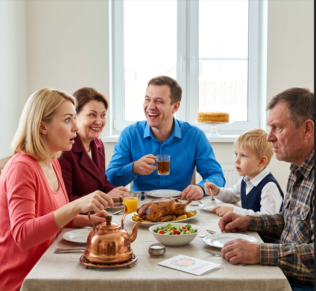 Я замерла с чайником в руках. Ждала, что Станислав сейчас одернет мать. Скажет: «Мам, хватит придумывать». Но муж лишь покрутил стакан в руке, посмотрел на меня с недоброй ухмылкой и произнес на весь стол: