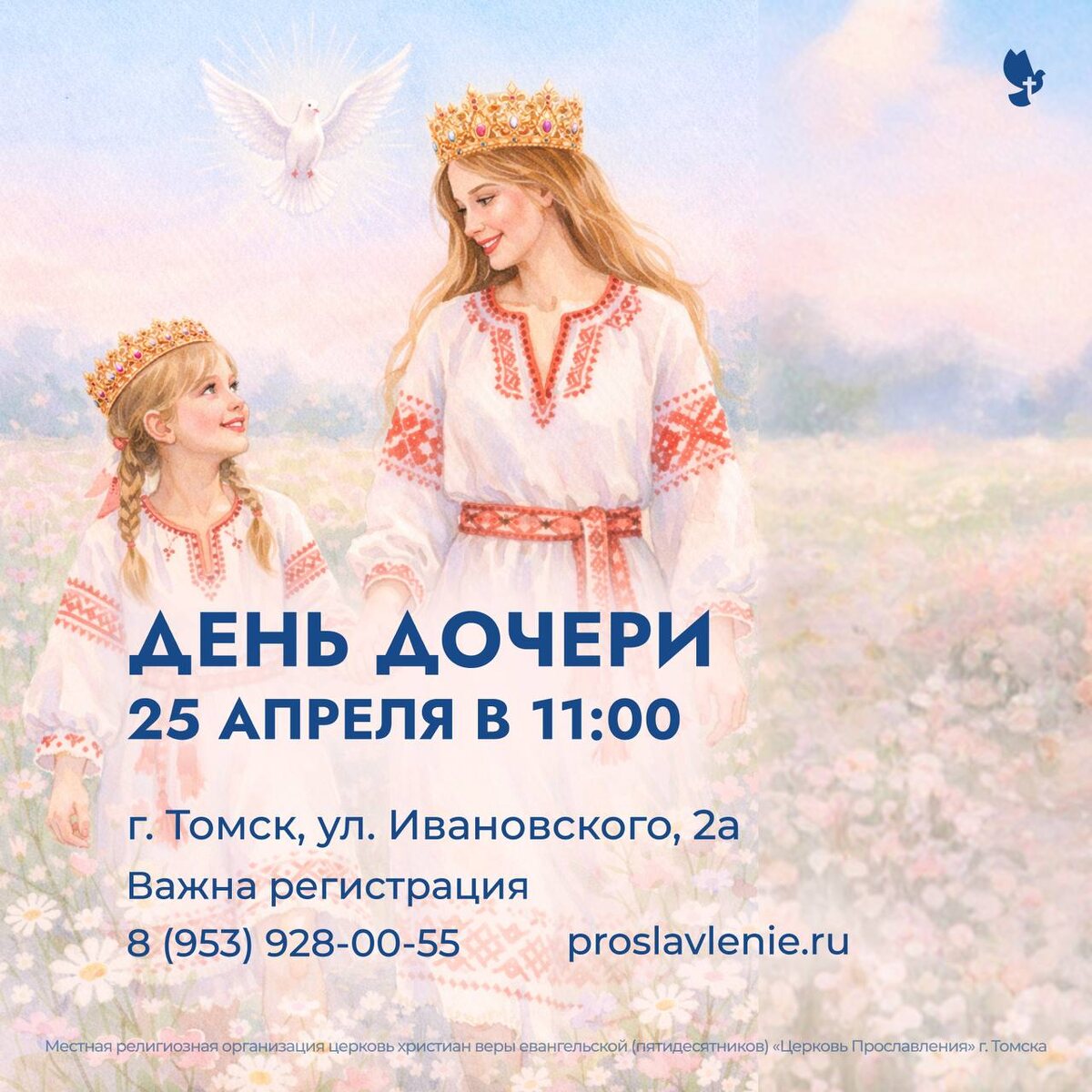 🔠🔠🔠🔠 🔠🔠🔠🔠🔠🔠🔠❤ посвящён девочкам и молодым женщинам разных возрастов. Праздник не имеет официального статуса, однако с каждым годом становится всё более популярным среди российских семей. В этот день принято уделять детям особое внимание, дарить подарки, проводить время вместе и создавать тёплую семейную атмосферу. Поэтому мы приготовили праздник 🎉 Когда? 2️⃣5️⃣ апреля в 1️⃣1️⃣ Где? Ул. Ивановского, 2а - Храм Регистрация важна⤵ Нажми 🟢Места ограничены 🟢Вход бесплатный 🟢ВОЗРАСТ дочерей 10+ и далее 🥰 Ждем вас - спешите регистрироваться 🥰