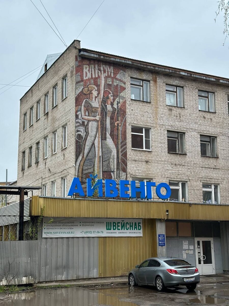 Мозаика на швейной фабрике. Ивановская область всегда была знаменита своими текстильными мануфактурами с огромным и богатым производством с дореволюционных времён. Об этом мы ещё расскажем, пока будем показывать швейные фабрики и мануфактуры в большом изобилии. А пока первая, уже советская швейная фабрика "Айвенго" с революционным мозаичным панно. Смотрите какие воинственные ивановские невесты под знаменем ВЛКСМ (всесоюзный ленинский коммунистический союз молодёжи). Бонусом дворовые ивановские утки. 📱 Архитекстура #Иваново