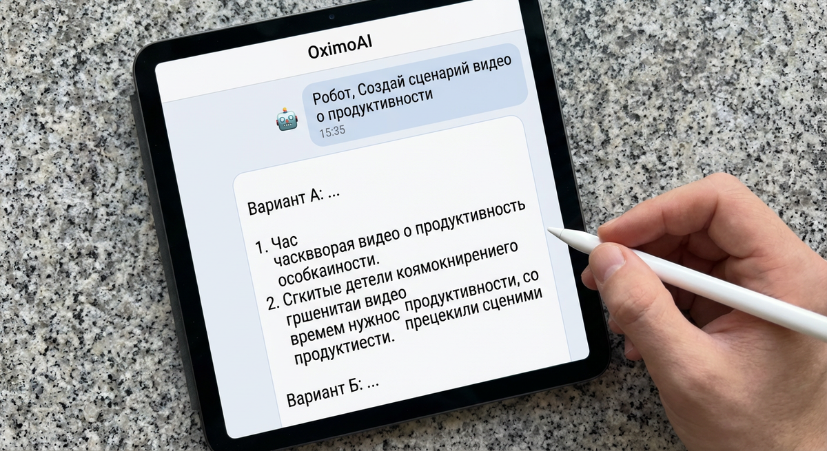 Бот вернёт готовую структуру с репликами, паузами и ремарками для монтажа. Можно попросить переписать в другом тоне или добавить юмор — всё в том же диалоге, нейросеть помнит контекст. OximoAI работает прямо в Telegram, без установки приложений и без регистрации на сторонних сервисах.