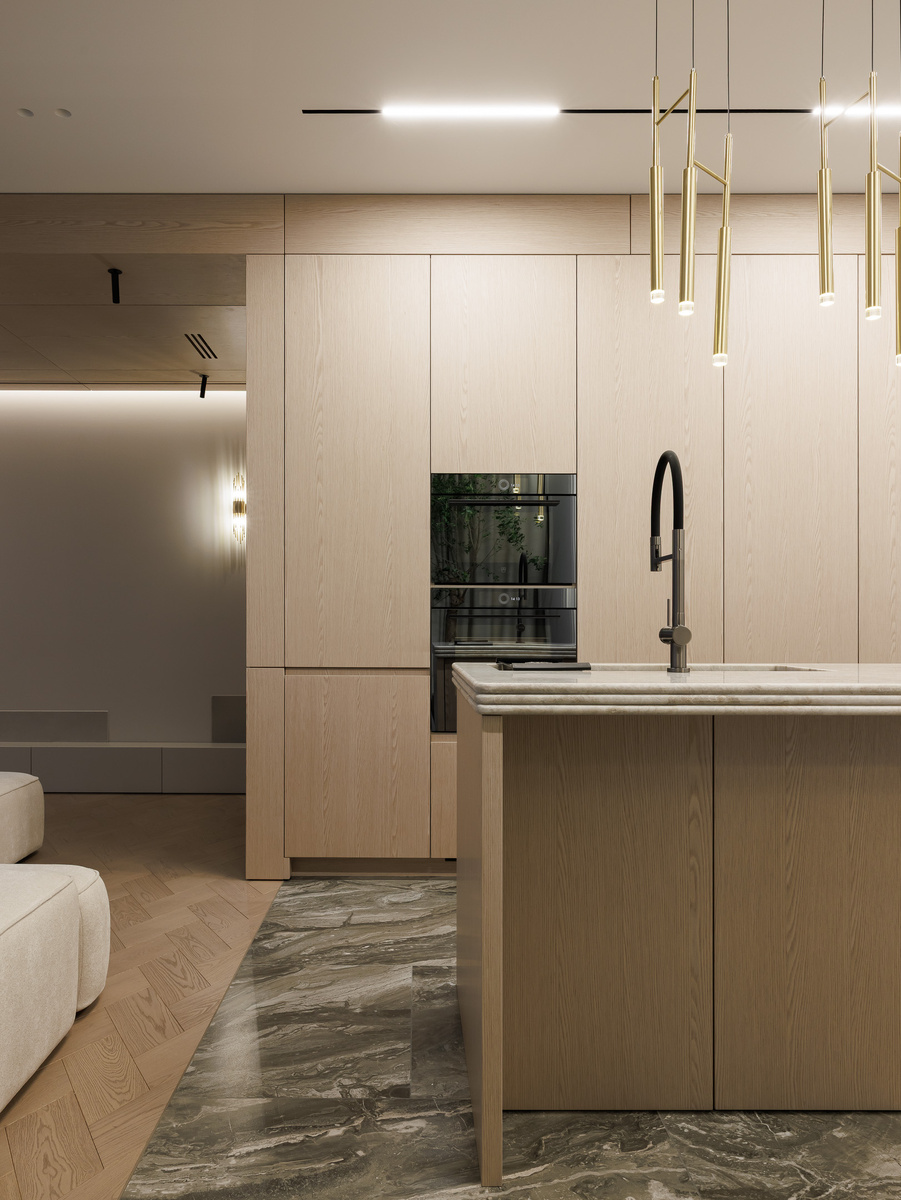 Рядом с кухней расположена зона гостиной, и по сути одно пространство плавно перетекает в другое. Этого удалось добиться за счёт единой отделки: стеновые панели продолжаются из кухни и формируют цельный архитектурный объём без визуальных разрывов. При этом в гостиной скрыто гораздо больше функционала. Помимо стен, мы проработали и потолок — он также выполнен в панелях, в которые интегрированы вентиляционные решётки, встроенные светильники и ревизионные лючки. Все технические элементы остаются незаметными и не нарушают чистоту пространства. Главная особенность — за потолочными панелями скрывается выдвижной экран домашнего кинотеатра. В обычном состоянии его не видно, но при необходимости гостиная легко трансформируется в полноценную зону просмотра. Как это происходит в действии — показали в одном из наших обзорных видео. Фото: Иван Сорокин