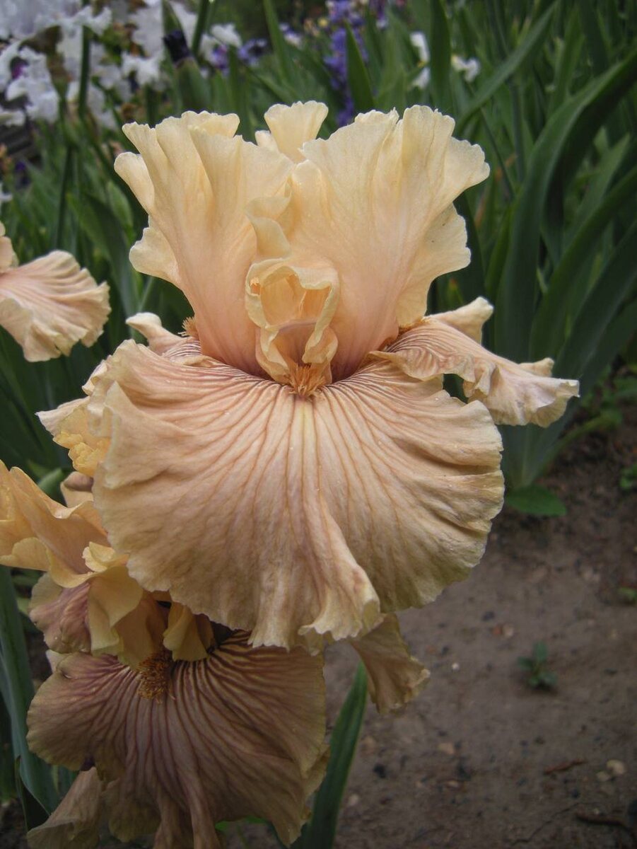 ☕️ Стандарты — от светло-кофейного до кофейного с медовым оттенком; фолы чуть глубже по тону, с выразительными кофейно-коричневыми прожилками по всему полю. Бородки: в горле — мандариново-бронзовые, на кончиках — лавандовые с кофейным налётом. Аромат с мускусной ноткой. От скрещивания 'Chardonnay And Ice' и 'Reckless In Denim'. Гибридизатор: Барри Блайт, 2007. Высота цветоноса: 91 см. Период цветения: средне-ранний.