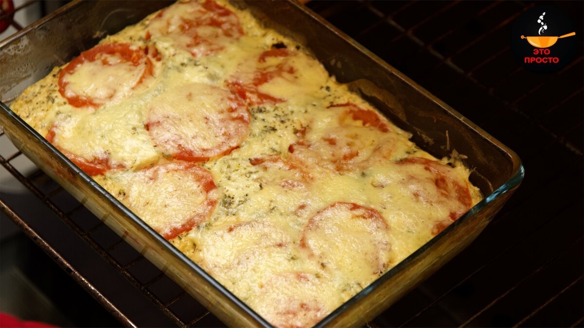 Нарезаем 800 г куриного филе небольшими кусочками. Солим и перчим по вкусу. Перекладываем в форму, смазанную маслом. В миске смешиваемвсе ингредиенты для заливки. Высыпаем 70 г тёртого сыра (2/3 от общего количества). Заливаем курицу смесью. Сверху выкладываем кружочки помидоров. Накрываем фольгой. Ставим в заранее разогретую до 200°C на 20 минут. Снимаем фольгу, посыпаем оставшимся сыром (30 г) и запекаем ещё 10 минут. Готово! Получается оч