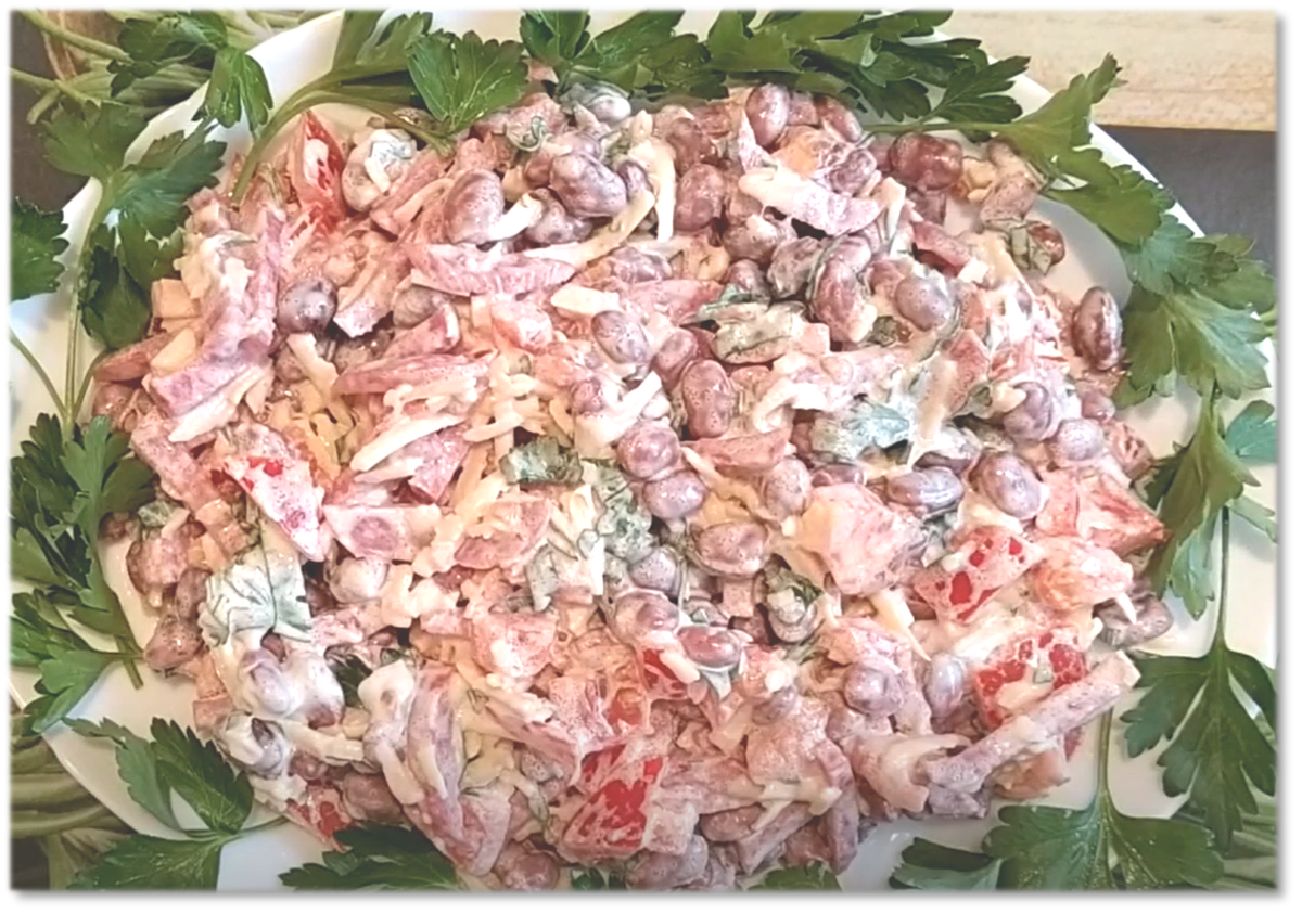 Всем привет! Очень люблю готовить салаты, которые готовятся на скорую руку и занимают 5-10 минут времени на приготовление. Салат «Обжорка» - не исключение. Данный салат понравился своим вкусом и быстрым вариантом приготовления. Итак, для салата я беру 50 грамм полукопчённой колбасы и нарезаю небольшими пластинками. Также натираю на крупной тёрке 50 грамм твёрдого сыра. Колбасу и сыр выкладываю в миску. Нарезаю небольшими кусочками 2 средних помидора и кладу 1 банку консервированной фасоли. Фасоль покупаю в собственном соку без томата. С зелени в этот раз применила петрушку. Взяла небольшой пучок, нарезала и выложила в миску. В качестве заправки использовала майонез. Майонеза добавила 2 столовых ложки и все перемешала. Готовый салат выложила в тарелку и по краям тарелки украсила веточками петрушки. Данный салат можно приготовить к ужину или использовать в качестве перекуса. Видео приготовления салата по ссылке: https://rutube.ru/video/558d3982c8a9b63284ae3337375be4c9/ Ставьте лайки, под