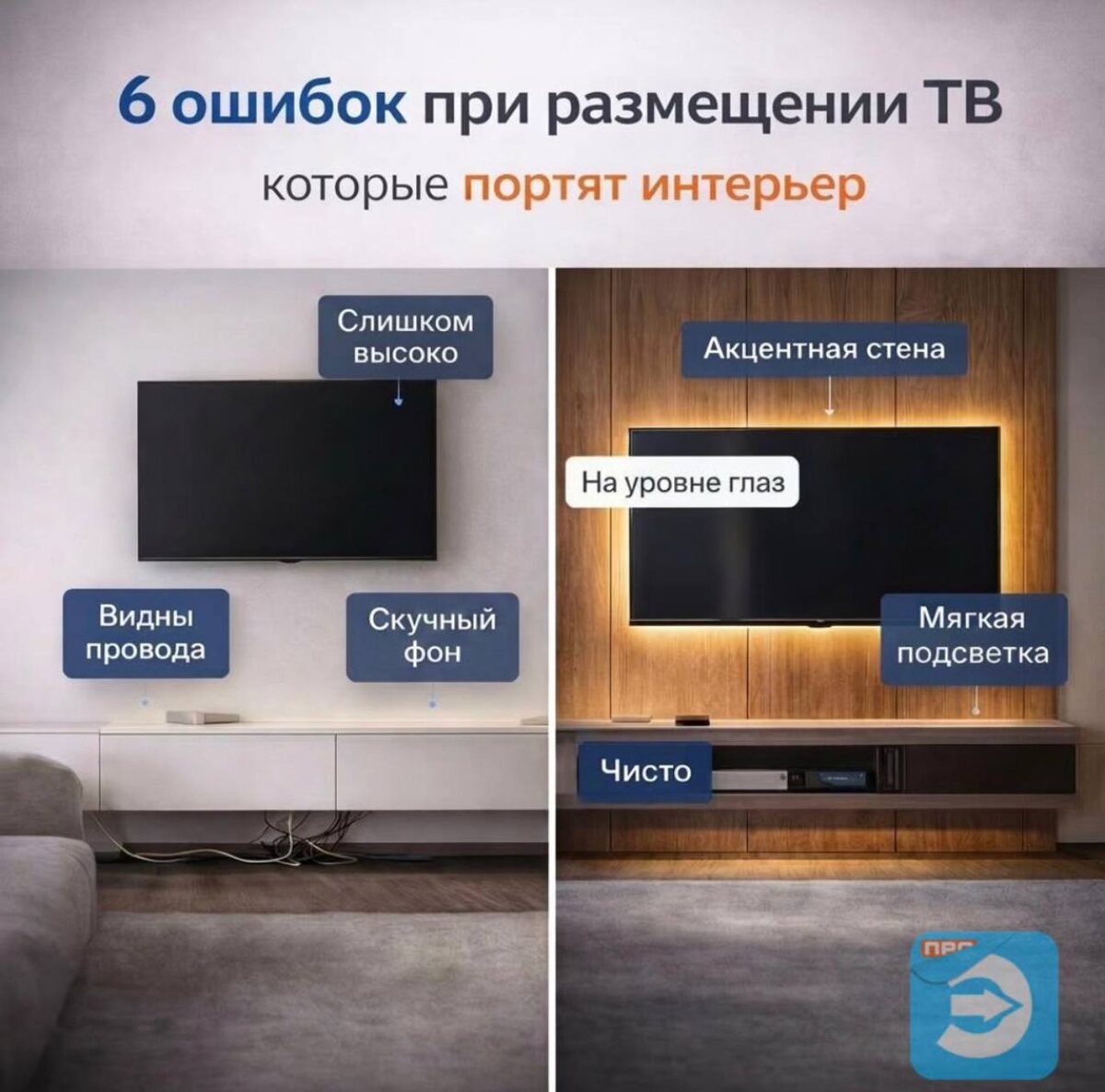 Самая частая ошибка делать телевизор центром всего. В итоге всё пространство начинает жить вокруг чёрного экрана, и интерьер теряет баланс. Грамотная задача не спрятать ТВ, а встроить его так, чтобы он работал вместе с пространством. Первое положение. Телевизор должен находиться на уровне глаз в сидячем положении. Если он висит выше, появляется напряжение в шее и дискомфорт при просмотре. Визуально это тоже сразу считывается даже дорогой интерьер начинает выглядеть неправильно. Второе фон. Просто белая стена самое базовое решение. Гораздо сильнее работают панели, шпон, декоративная штукатурка или даже мягкие текстуры. Когда у ТВ есть фон, он перестаёт выпадать и становится частью общей композиции. Третье окружение. Пустая стена с телевизором почти всегда выглядит недоделанной. Консоль, встроенные модули или лёгкая система хранения помогают собрать зону и делают её завершённой. Важно не перегрузить всё должно быть в балансе. Четвёртое свет. Контраст чёрного экрана и тёмного помещения ут