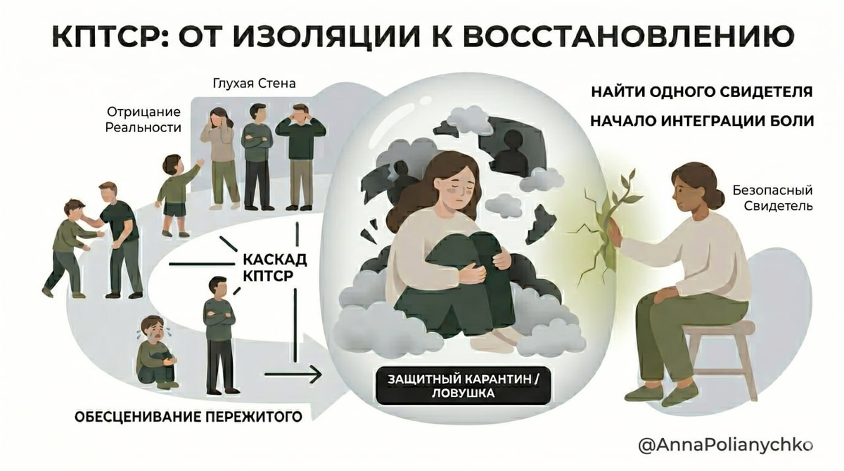 длительный абьюз или пренебрежение со стороны значимых близких закладывают глубокие изменения в психику, перестраивая настройки выживания под режим постоянной угрозы. череда травмирующих событий в детстве наносит первый удар и формирует фундамент расстройства. однако основные проблемы разворачиваются позже, тогда, когда ты остаешься со своим тяжелым опытом абсолютно одна. психика получает ущерб не только от самого насилия. главная катастрофа случается при попытке найти помощь, когда ты наталкиваешься на стену непонимания. тебе просто некому рассказать о пережитом кошмаре, а близкие просто отворачиваются, советуют всё забыть или оправдывают агрессора. твою реальность отрицают, а боль обесценивают. в этот момент психика делает единственно возможный вывод: окружающий мир небезопасен и люди несут угрозу. чтобы выжить в непредсказуемой враждебной среде, ты экстренно увеличиваешь дистанцию с социумом, возводя защитный карантин. отдалиться от людей и спрятаться внутри себя — гениальное решени
