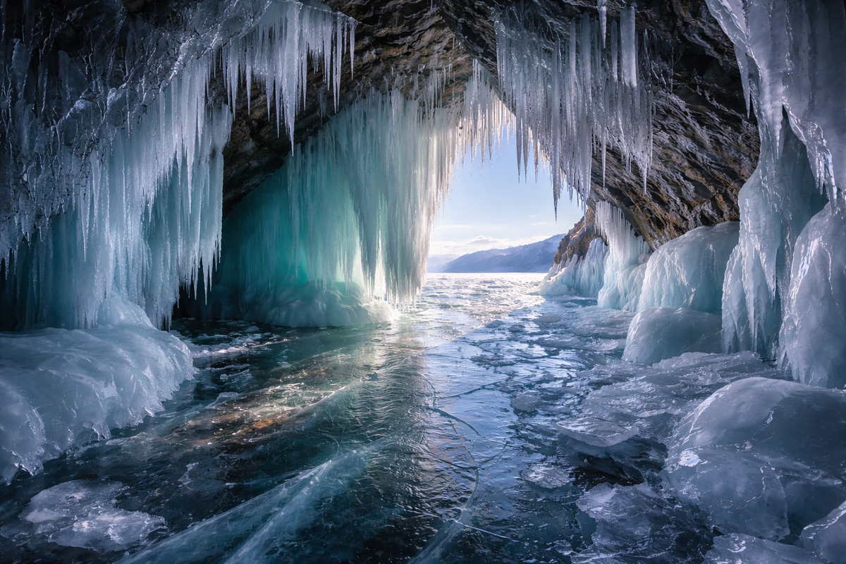 Зимой берега Байкала меняются до неузнаваемости. Там, где летом — камни, скалы и открытая вода, появляются ледяные образования, которые больше похожи на застывшие волны. Особенно это заметно у крутых берегов, где скалы уходят прямо в воду. Именно здесь образуются ледяные гроты — природные пещеры, созданные ветром, волнами и морозом. Всё начинается ещё осенью, когда Байкал только начинает остывать. Вода у берегов долго остаётся подвижной, и волны продолжают биться о камни. Когда температура падает, брызги, попадая на холодные поверхности, мгновенно замерзают. Слой за слоем, день за днём, нарастает лёд, повторяя форму скал и выступов. Зимой этот процесс продолжается. Даже когда основная часть озера уже покрыта льдом, у берегов движение воды сохраняется дольше. Волны подмывают край льда, подтачивают его снизу, а сверху на него нарастает новый слой. В результате образуются навесы — ледяные карнизы, которые со временем превращаются в настоящие пещеры. Внутри таких гротов — особая атмосфера.