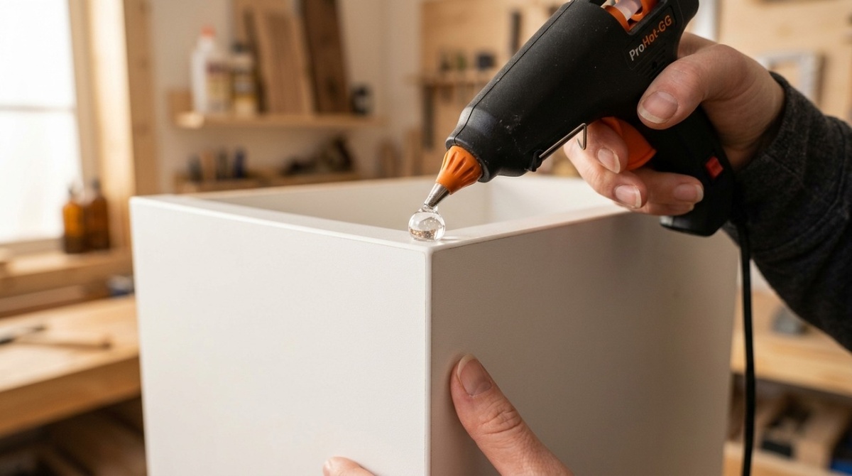 Термоклей — это не просто клей, это по сути жидкий пластик (этиленвинилацетат), который застывает в упругую, химически нейтральную массу. Мастера знают: его можно использовать как амортизатор, который спасет вашу мебель и нервы. В отличие от суперклея, термоклей остается эластичным после застывания. Он работает как резиновая подушка: гасит вибрации, распределяет давление и имеет высокий коэффициент трения (не скользит). 1. «Бесшумные» двери и ящики