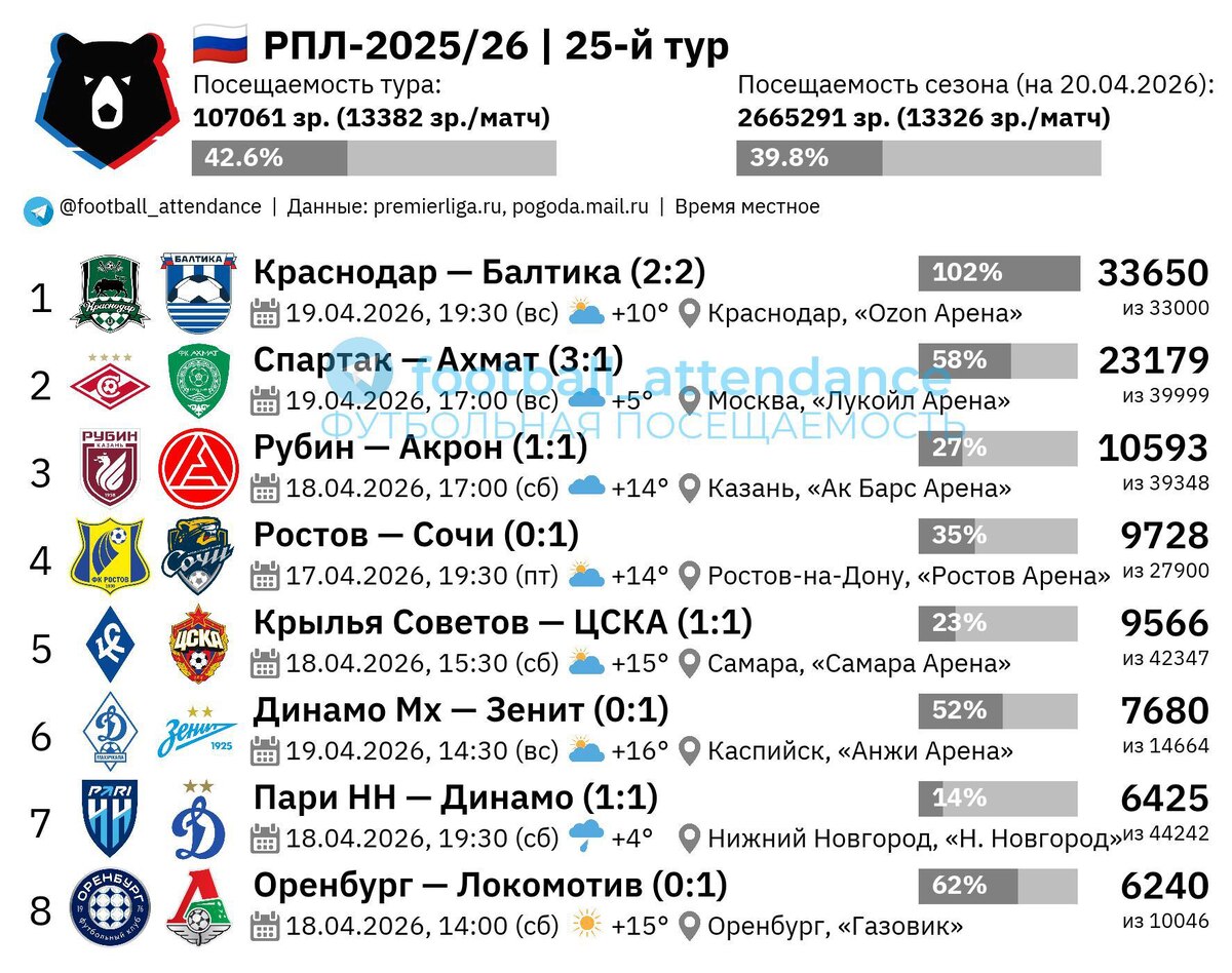 Средняя аудитория каждого матча тура (13382) была эквивалентна средней всего текущего сезона (13326). Больше всего зрителей (33650) и максимальное наполнение (102%) стадиона было в Краснодаре. Для «Краснодара» игра с «Балтикой» стала 4-й по числу зрителей в текущем сезоне РПЛ. Напомню, что в Реестре сертификации стадионов РФС вместимость арены «быков» составляет ровно 33 тысячи мест. На встречу «Спартака» и «Ахмата» пришло 23179 человек, что равно средней аудитории на «Лукойл Арене» в этом сезоне РПЛ (23596). Аудиторию, которая больше личной средней посещаемости в текущем сезоне, в этом туре собрали: Меньше своего среднего значения собрали «Рубин» (13445 -> 10593) и «Ростов» (11442 -> 9728). Лидеры домашней посещаемости РПЛ после тура (более 14 тысяч зрителей в среднем на каждом домашнем матче): Посещаемость тура Заполняемость стадионов Не забывайте подписаться на канал здесь на Дзен, а также в Телеграм и МАХ! Также вы можете отблагодарить мою работу донатами на главной странице канала