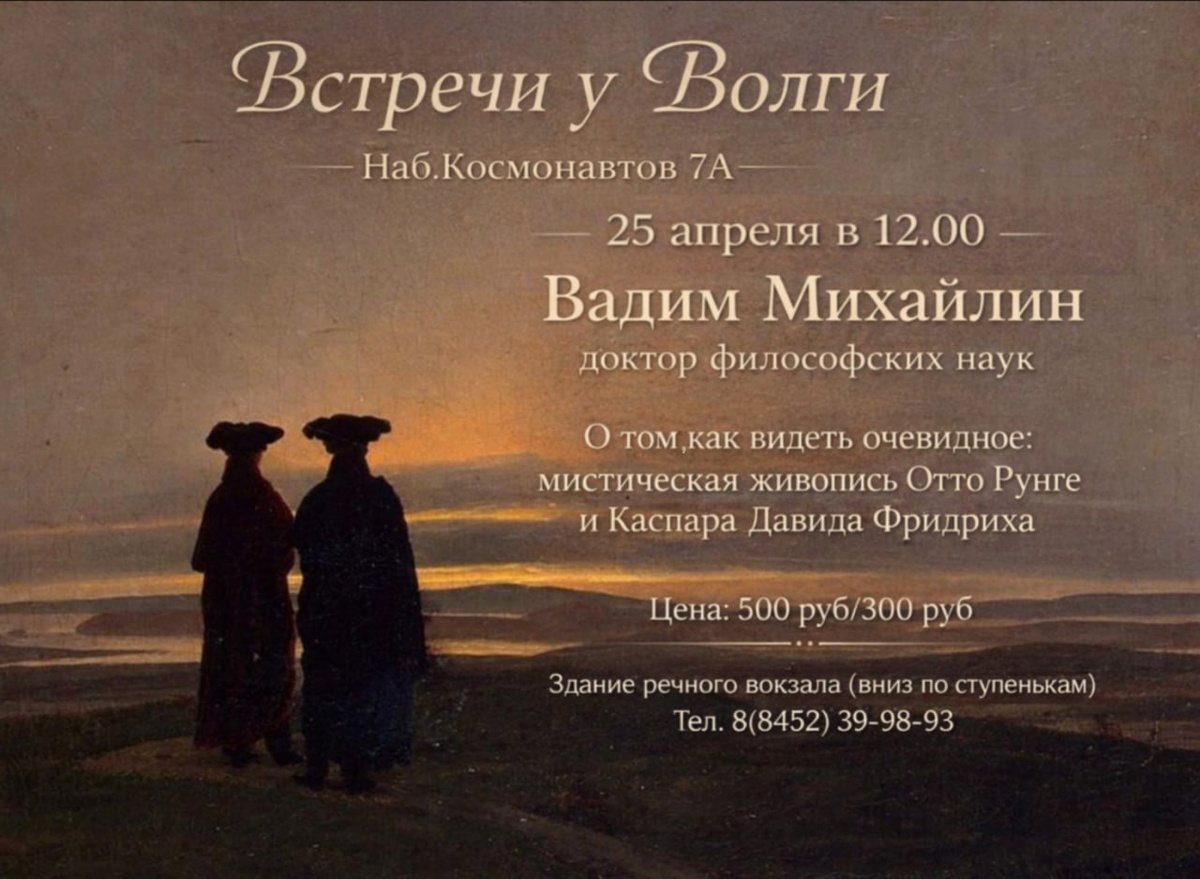 » Лекция «О том, как видеть очевидное: мистическая живопись Отто Рунге и Каспара Давида Фридриха» из цикла «Символические коды в модернистской европейской культуре» доктора философских наук, кандидата филологических наук Вадима Михайлина начнётся 25 апреля в 12:00. Вход: 500 руб./300 руб. (по студенческому билету). Подробнее: vk.com/wall-97937171_1897 Арт-пространство «Волга» находится в здании Речного вокзала (далее — вниз по ступенькам). Возникшие вопросы можно задать по тел.: 8(8452)39-98-93. #sar_most_25_04_2026