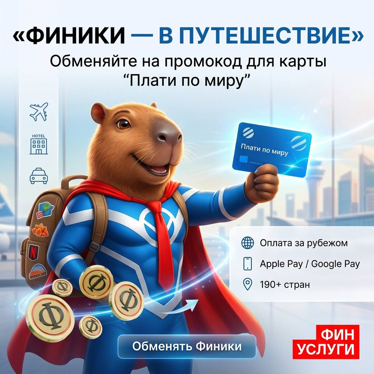 Авиабилеты, отели, такси, кафе и магазины за рубежом — всё это удобнее оплачивать картой, которая работает за пределами РФ. Теперь на Финуслугах можно обменять Финики на промокод для выпуска иностранной дебетовой карты «Плати по миру». Что умеет карта: 🔹 работает за рубежом через Apple Pay и Google Pay 🔹 доступна в 190+ странах 🔹 подходит для отелей, авиабилетов, такси и покупок 🔹 оформляется онлайн 🔹 пополняется через СБП Хороший вариант, если поездка уже запланирована — или хочется подготовиться заранее. 👉 Обменять Финики на промокод