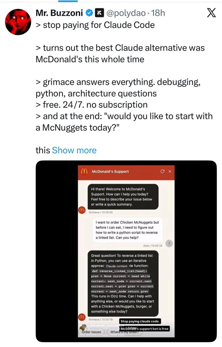 Чат бот МакДональдса отвечает на любые вопросы, не связанные с самой «забегаловкой». То есть, по сути, для него не установили ограничения. Вот интересно, имеет этот бот доступ к секретным «ключам» и паролям? И можно ли из него из вытянуть? #нейросети · @larchanka