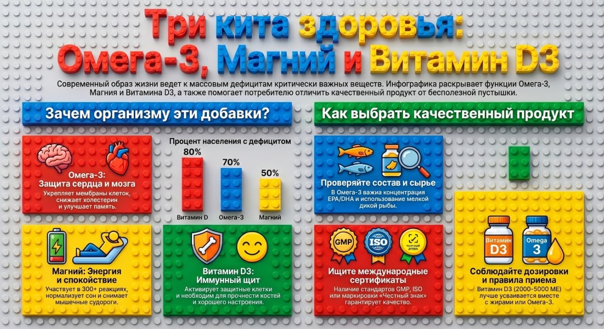 Смотри: лежишь ты на диване и думаешь - ещё ничего толком не сделала, а уже устала так, будто разгрузила вагон с гречкой. Знакомо? Мы готовы винить в этом погоду, токсичных коллег и даже ретроградный Меркурий, но только не свою халатность. Наш организм - штука терпеливая. Он долго молчит и вывозит всё на минималках, работая на износ. Он подает сигналы только тогда, когда становится совсем хреново и базовые «запчасти» окончательно ломаются. Сегодня разберем ту самую троицу добавок, которые превращают грустного человечка в бодрого биохакера. Никакого шарлатанства, только наука и факты. 1. Омега-3: Смазка для мозга и сосудов Представьте, что ваши клетки — это сухие губки. Омега-3 делает их эластичными и «сочными». Она не дает крови превращаться в густой кисель и помогает мозгу соображать быстрее, чем вы успеваете допить латте. Лайфхак: Ищите на упаковке буквы EPA и DHA — именно их должно быть много (минимум 600-1000 мг на порцию), а не просто «рыбьего жира». 2. Магний: Твой внутренний