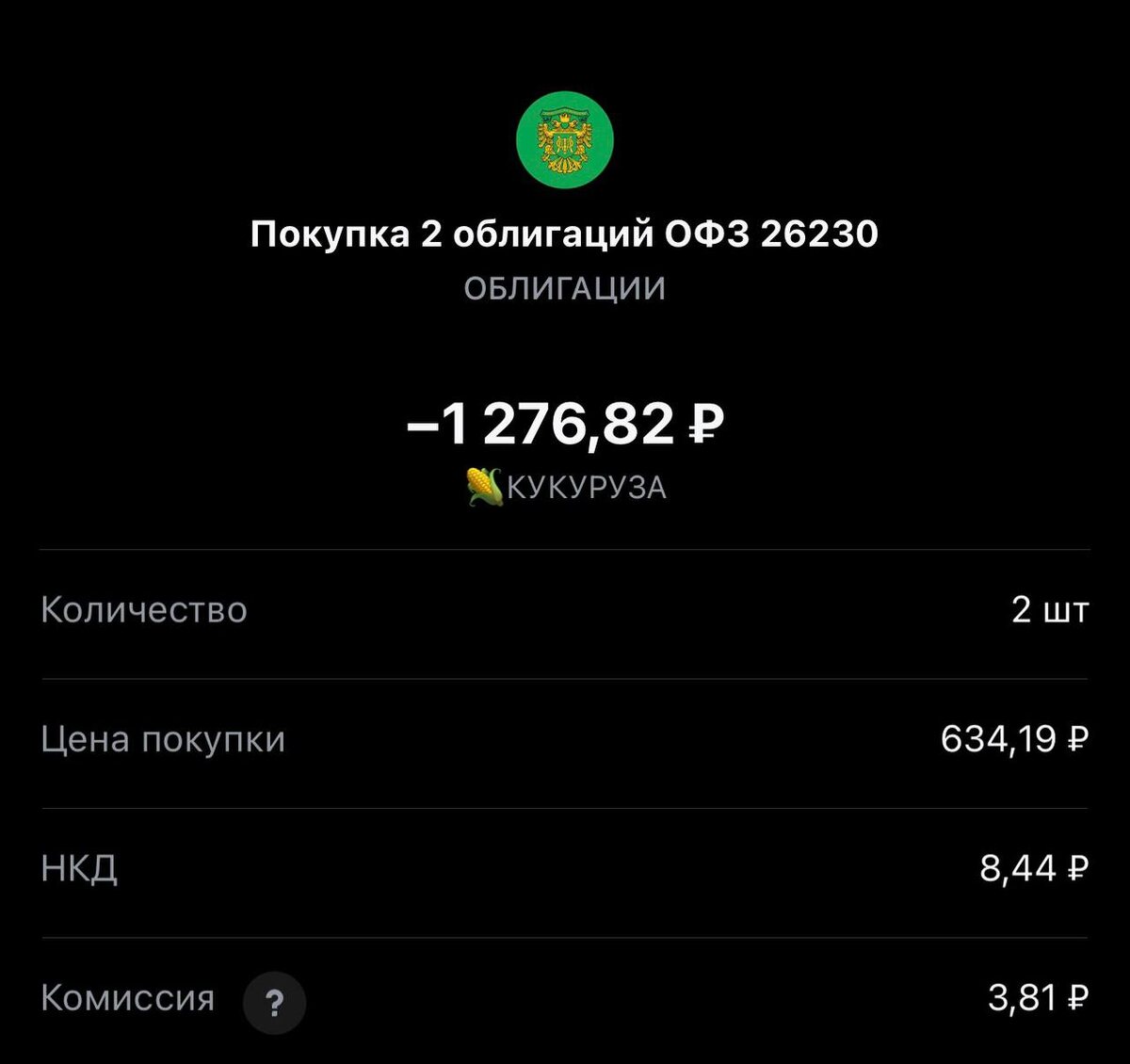 ! сегодня #35 покупка в стратегию #КУКУРУЗА "ОФЗ 26230" Тикер: #SU26230RMFS1 Цена покупки: 634.19 rub 2 лота ☝️для этой стратегии желательно открыть отдельный счет и иметь на балансе 1000 рублей к 20 числу ежемесячно. Покупку буду выкладывать в канал с хештегом #кукуруза по нему будет проще найти все сделки. Если деток двое, трое 👦пополняем счет на 2000, 3000 rub соответственно Отличие от других стратегий -горизонт инвестирования от 5-ти лет стратегия портфеля- покупки в долгосрок срок удержание позиции: от шести месяцев горизонт инвестирования: от пяти лет цель 💼: мечта, обучение, дорогая покупка, путешествие все сделки можно найти по хештегу #кукуруза TG MAX
