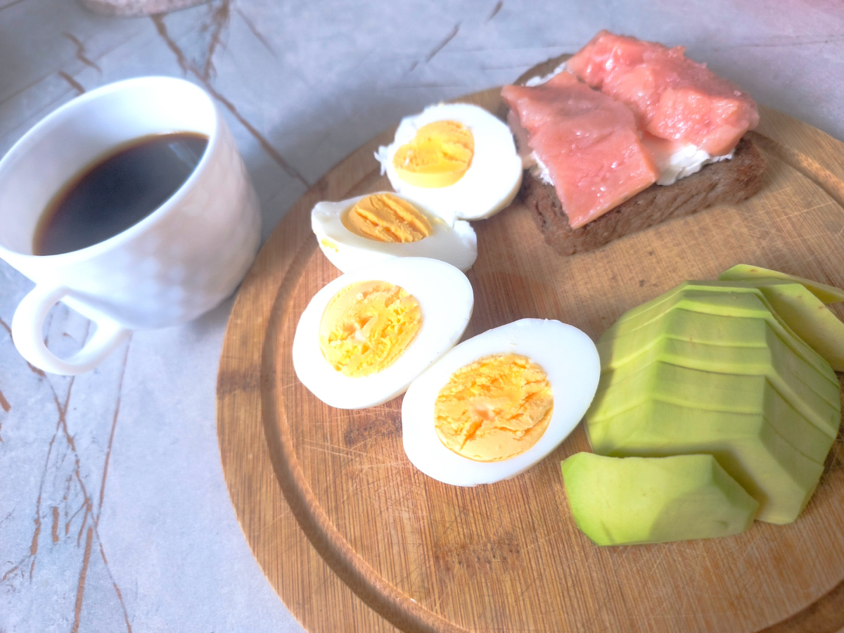 2 вареных яйца, тост из цельнозернового хлеба +творожный сыр+горбуша слабосолёная. Половинка авокадо. Кофе растворимый .+витамин Д.
