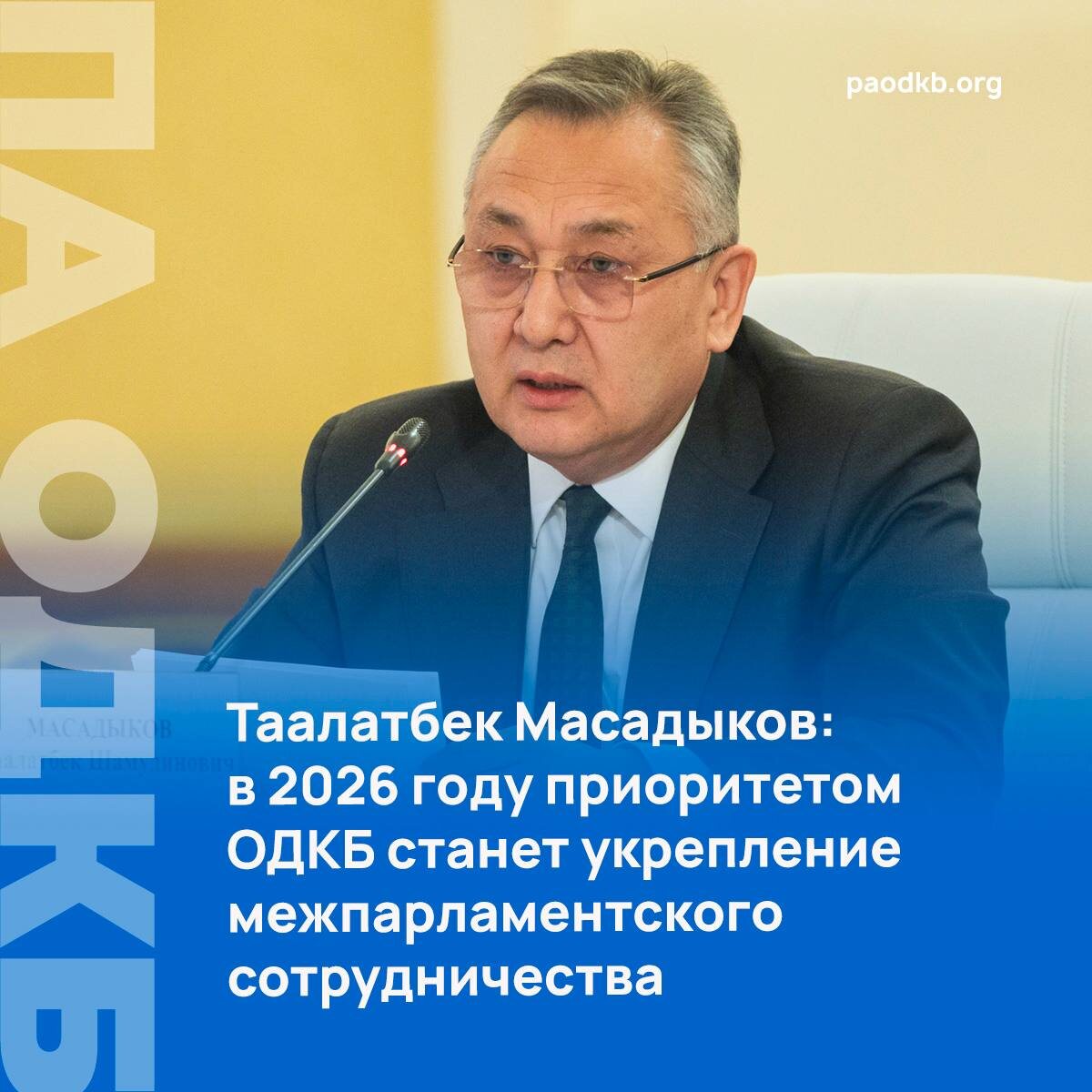 эффективность. Об этом заявил Генеральный секретарь ОДКБ Таалатбек Масадыков, выступая на заседании Совета Парламентской Ассамблеи Организации, которое состоялось 20 апреля в Москве. «Нашим приоритетом в текущем году будет укрепление роли межпарламентского сотрудничества. Важной задачей остается придание Парламентской Ассамблее самостоятельного правового статуса как органу парламентского сотрудничества в соответствии с уставом ОДКБ», - подчеркнул Таалатбек Масадыков. 🤔Он напомнил, что в 2026 году Парламентской Ассамблее Организации Договора о коллективной безопасности исполняется 20 лет. В связи с этим планируется проведение международной парламентской конференции, приуроченной к юбилею. «Секретариат Организации готов оказать содействие в проведении этого мероприятия на международном уровне. Уверен, что более тесная координация нашей работы укрепит потенциал ОДКБ и будет способствовать формированию эффективного пространства безопасности в Евразии», – заключил Генеральный секретарь