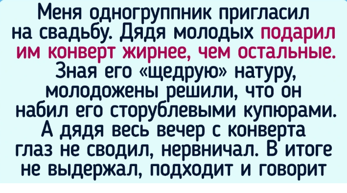Меня одногруппник пригласил на свадьбу. Дядя молодых подарил им конверт жирнее, чем остальные. Зная его «щедрую» натуру, молодожены решили, что он набил его сторублевыми купюрами. А дядя весь вечер с конверта глаз не сводил, нервничал. В итоге не выдержал, подходит и говорит: «Вы конверт спрячьте, а то сворует кто-нибудь, я вам 300 000 на свадьбу отложил». Это был 2011-й год, провинция. Надо ли говорить, что он стал самым любимым дядей в тот вечер. © Barahloff