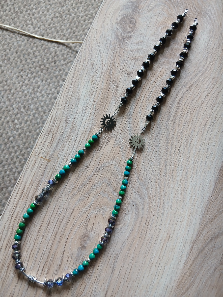 Здравствуйте, вот и наметился мой "Волшебный лес"), в задумке виделось звездное небо и серо-зеленый лес. Самое смешное, что солнышки я хотела желтые заказать, но ошиблась и в корзине оказались серебряные и ведь пригодились, прямо в тему)) Будет ещё одна нитка и кулон, так что провожусь своими темпами еще неделю, не меньше. И наметилась "Холодная весна", тоже в два ряда, будут серебряные цепочка и бабочки. Примерно так, но с процессе может многое поменяться. Начала в тетрадь зарисовывать идеи, а то их много и я просто забываю. Закажу бусины, а потом думаю, а к чему это? Была же идея, но сплыла, теперь всё задокументировано будет)) Всё можно было купить со скидкой 50%, цены пишу полные. Рубашка из толстого серо-голубого вельвета. Подол просто обрезан и разлохмачен, есть удобные боковые карманы. Хлопок. Жакет померила из-за любопытства, талия, конечно, не на месте, поэтому жакет тянет. Без состава, но похоже на синтетику. Физика в действии. Поглажу бахрому и она дыбом встаёт, потом ме