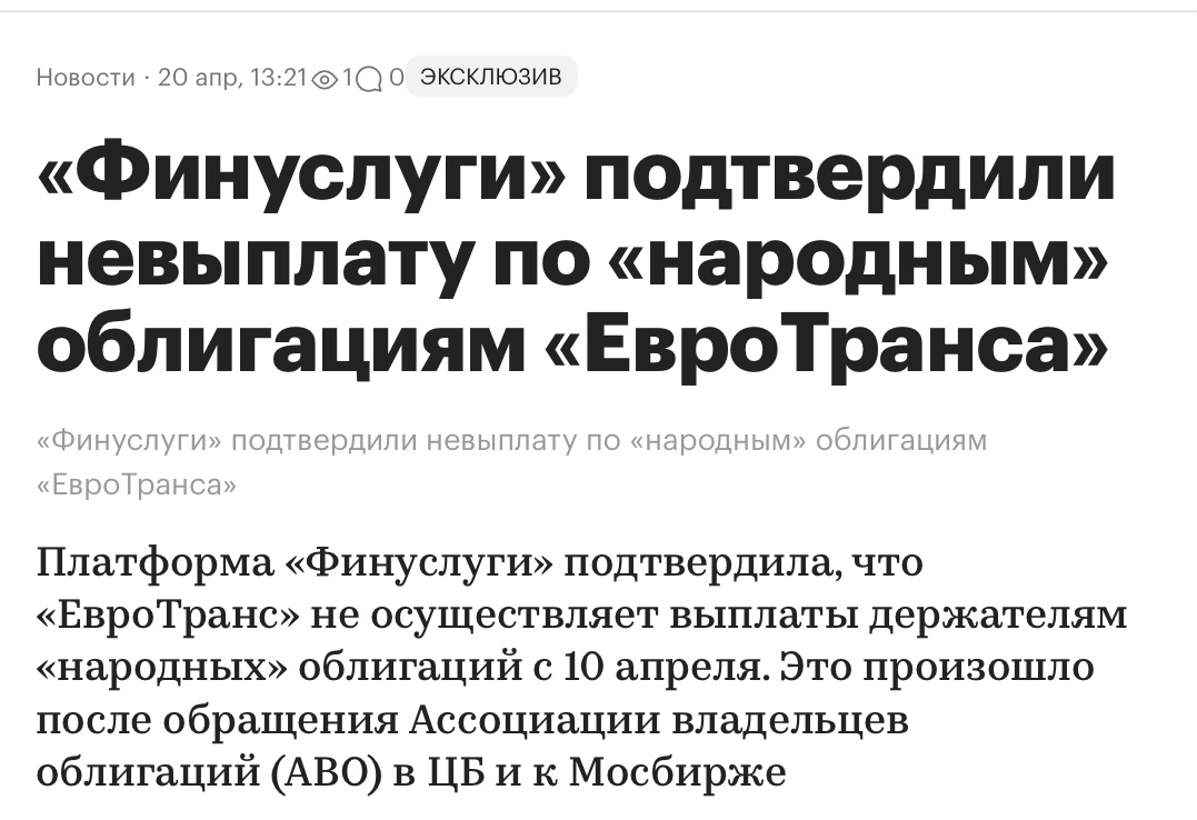 У моего «любимого« Евротранса : Новости приходят каждую неделю. Теперь выяснилось, что компания не выкупает свои «народные облигации» уже с 10 апреля : На таких новостях ценные бумаги эмитента активно бурят новое дно: Наши же апологеты Евротранса: Левченко: Коган: Абсолютно молчат по теме. Первый ударился полностью в геополитику, а второй переключился на общеэкономические темы, а также других эмитентов (это будет тема отдельной статьи). Вот последний пост Когана про Евротранс: Обратите внимание !!! Ни слова про риски «народных облигаций». Продолжал рассказывать про «длинные облигации». Кстати, про амортизацию в облигациях Евротранс3 в июне 2026 года, Коган также умолчал. Что еще раз показывает, то ли квалификацию «финансиста», то ли его избирательность. Удачи и трезвого анализа в ваших инвестициях!!! P.S. Подписывайтесь на мой телеграмм-канал: https://t.me/Cervonets