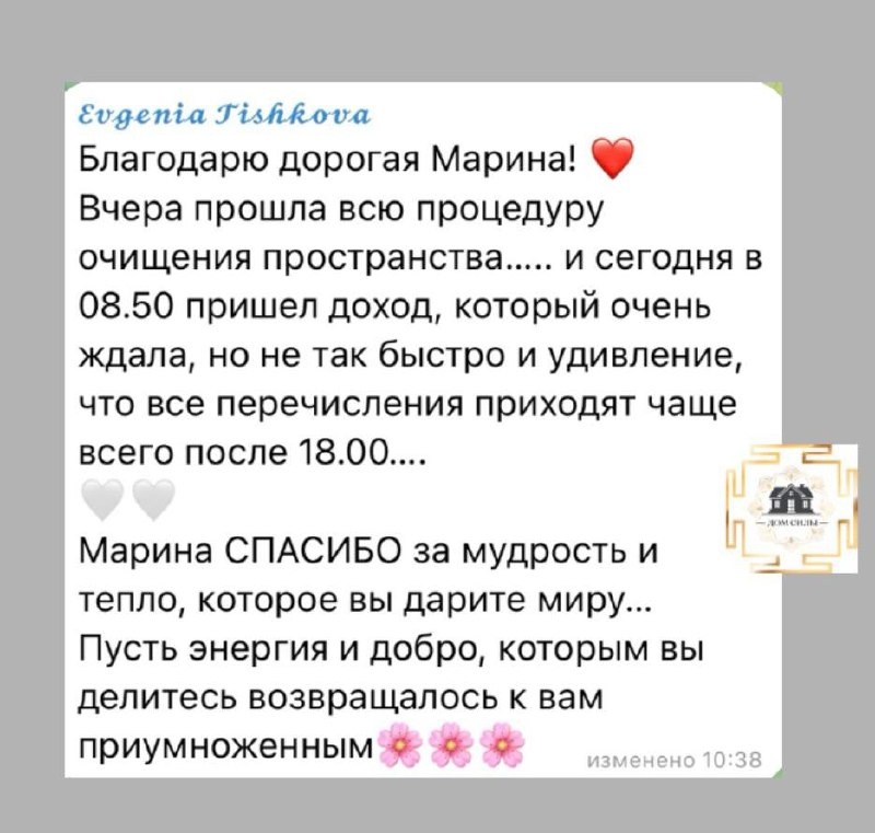 Все случается наиболее благоприятным образом для вас. Мой 🎁 вам сегодня- кто забирает практику -гайд ОЧИЩЕНИЕ ПРОСТРАНСТВА ПО ВАСТУ бонус сильные дни для очищения на ближайшие 10 дней! ❗️Бонус действует сутки. До 21.04 13:00 ➡️ ЗАБРАТЬ ГАЙД ОЧИЩЕНИЕ ЭНЕРГИИ ПРОСТРАНСТВА Очищение пространства по Васту помогает (ВЫ ПРИМЕНИТЕ ПОШАГОВЫЕ РЕКОМЕНДАЦИИ И ПОЛУЧИТЕ ОЩУТИМЫЙ РЕЗУЛЬТАТ): ✅ Уходят застойные программы: обиды, страхи, чужие влияния. ✅ Освобождается место для нового — для радости, денег, любви, неожиданных приятных событий. ✅ Восстанавливается баланс пяти первоэлементов, и дом начинает работать как ваша личная батарейка, а не как пылесос негатива. ✅ Легче дышится, спокойнее спится, уходят беспричинные раздражение и тревога.