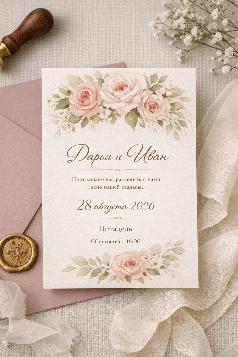 Я всегда говорю своим парам: пригласительные – это не просто карточка с датой. Это первое касание вашей свадьбы. Именно с них начинается ощущение праздника. Ещё до платья, до площадки, до музыки – гости получают приглашение и уже примерно понимают, какой будет этот день. По пригласительным считывается всё: настроение, стиль, даже ваше отношение к деталям. И да, маленький организационный момент, о котором часто забывают: приглашения не делаются в последний момент. Обычно к ним приходят, когда уже понятны формат свадьбы и список гостей – как раз на этапе активной подготовки. Здесь нет правильного или неправильного варианта – есть тот, который подходит именно вашей свадьбе и вашим гостям. Бумажные пригласительные Это то самое «ощущение свадьбы в руках». Конверты, фактура бумаги, каллиграфия, иногда сургуч – всё это добавляет ценности моменту. Электронные пригласительные Практично, быстро и очень гибко. Это может быть красиво оформленный файл, анимация или даже мини-видео. Гибридный формат