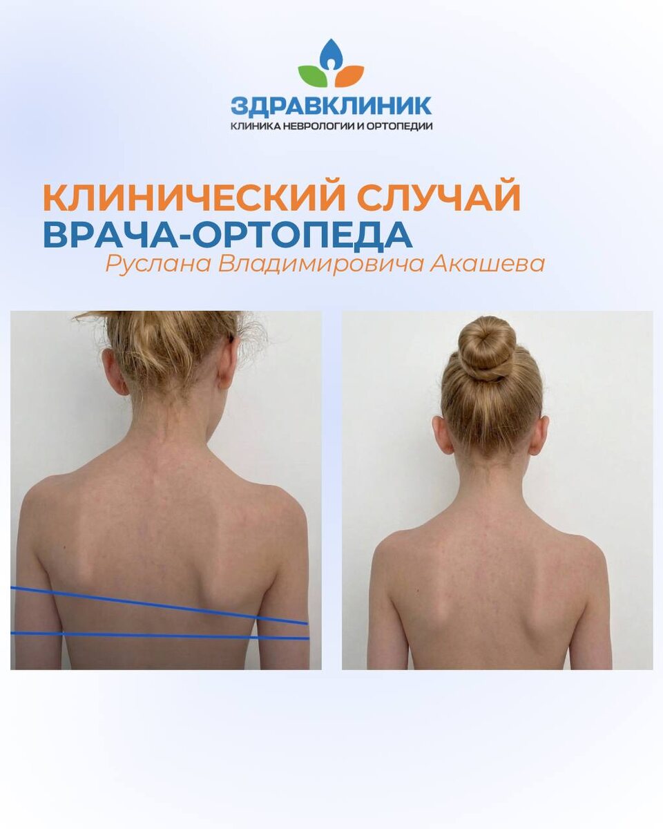 Беговая Руслана Владимировича Акашева Пациентка — девочка, 13 лет. Обратилась с жалобами на быструю утомляемость спины, ощущение перекоса в плечах и невозможность долго удерживать ровную осанку. До лечения При осмотре отмечалась выраженная постуральная асимметрия: • Плечи располагались на разной высоте: одно плечо было заметно выше другого. • При наклоне корпуса вперёд чётко визуализировались выступающие медиальные края лопаток — так называемые «крыловидные лопатки», что указывает на нарушение стабилизации лопаточно-грудного комплекса. • Девочка быстро уставала держать спину прямо: уже через короткое время появлялось ощущение тяжести и напряжения в межлопаточной области. • Несмотря на попытки выпрямить спину и расправить плечи, удерживать физиологическое положение позвоночника длительно не получалось из-за слабости мышц-стабилизаторов. • Грудная клетка была недостаточно стабилизирована, плечи смещались вперёд и «заваливались» внутрь. • На этом фоне нарушалась биомеханика плече
