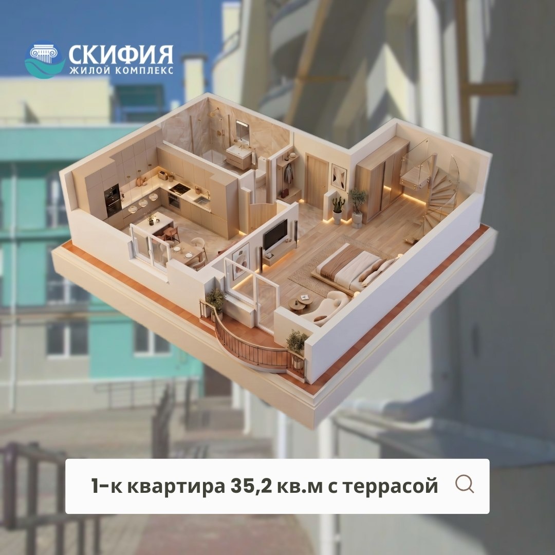 ☀️ 📌 Дом №8 «Фрегат», ЖК «Скифия» | Квартира №18 Удобная планировка и приятный вид из окна во внутренний двор — то, что ценят в повседневной жизни. ➡️ Спальня — 18,4 м² Пространство, где легко организовать зону отдыха и сна. Из комнаты есть выход на французский балкон — больше света и воздуха в интерьере. ➡️ Кухня — 9,7 м² Просторная и удобная. Можно не только готовить, но и собирать друзей за общим столом. ➡️ Санузел — 3,6 м² Именно в ванной комнате начинается утро, поэтому важно, чтобы это пространство было уютным и функциональным. ➡️ Открытая терраса Из спальни есть отдельный выход на террасу. Это пространство с видом на двор и бухту. Место, которое можно адаптировать под себя. Можно пить утренний кофе на свежем воздухе, обустроить небольшую лаунж-зону или спортивный уголок. Такая терраса добавляет квартире ощущение свободы и “своего” пространства вне стен. Как все может выглядеть, мы показали в визуализациях. Финальный дизайн интерьера и наполнение всегда остаются за вами.