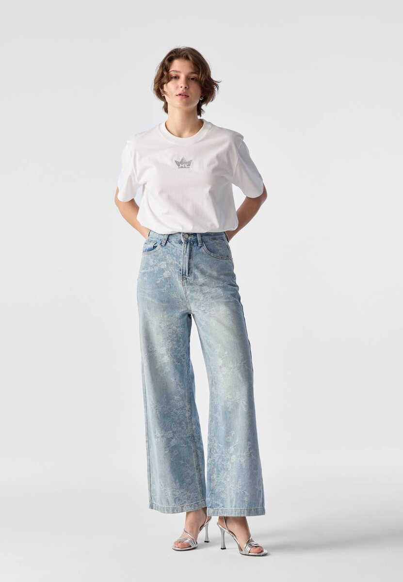 Модель выполнена в актуальном силуэте Wide Leg (широкие штанины), который создает расслабленный, но стильный образ.