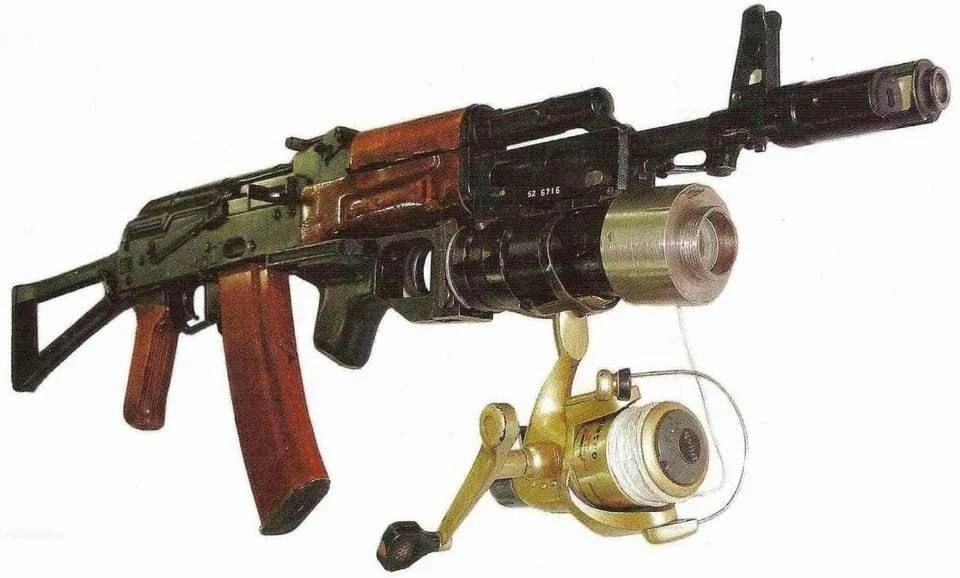 Всякие прибамбасы разрабатывались в условиях резко меняющихся подходов к применению различного вооружения и появления универсальных платформ. Перед вами система разминирования "Трал" на базе АКС74. На первой картинке, где металлическая болванка на ВОГ25П, заряд выстреливается при помощи ГП, причём даже планировалось вмонтировать в забрасываемый элемент - съемный блок с генератором электромагнитного излучения для подрыва замаскированных мин и мин, в том числе, реагирующих на изменение магнитного поля. Так или иначе появлялось множество вариантов различных "обвесов" для тех или иных целей, где абсолютное большинство подобных решений так и не нашло применения и оказалось на свалке истории. Однако известны случаи, когда предложенный вариант сначала был отвергнут, а спустя некоторое время всё таки нашёл применение. Конечно же при этом чаще речь идёт об усовершенствовании или переосмыслении существующих технологий. Хотя в данном конкретном случае данная разработка будет интересна только