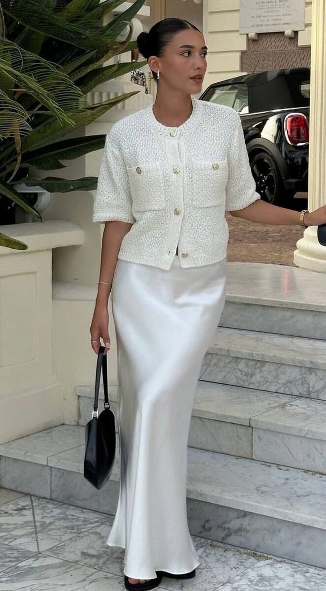 Кардиган на пуговицах + атласное платье / юбка Такой образ подчеркнет женственность и будет выглядеть изысканно. На весну-лето выбирайте светлые оттенки: слоновая кость, айвори, жемчужный, пудровый. Они выглядят особенно роскошно. Дополните платье или юбку кардиганом из плотного трикотажа с золотой качественной фурнитурой. Канал в MAX