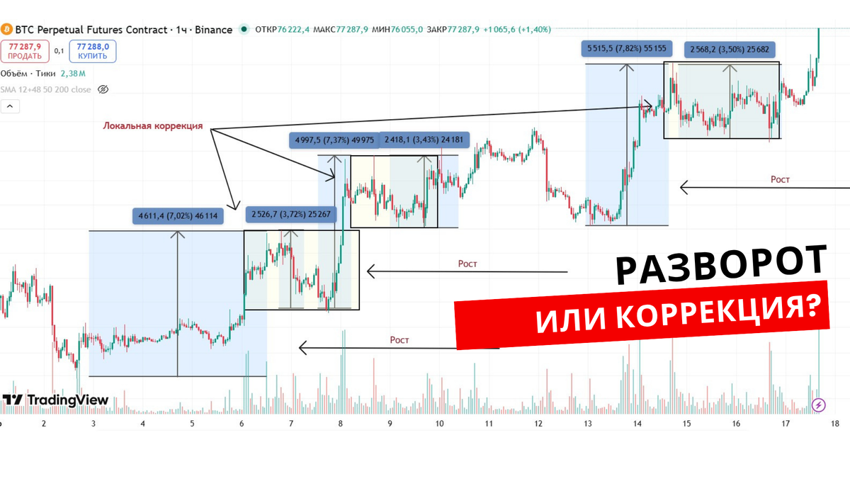 Ключевое отличие коррекции от разворота — тренд остается неизменным. Структура движения не ломается, просто происходит временная пауза или откат. После коррекции цена продолжает движение в направлении основного тренда, часто даже с большей силой чем до этого. Глубина нормальной коррекции в сильном тренде обычно составляет от 30% до 50% от предыдущего импульса. Если актив вырос на 20%, откат на 6-10% это классическая здоровая коррекция. Откат глубже 61.8% от импульса уже ставит под вопрос силу тренда и может быть началом разворота.