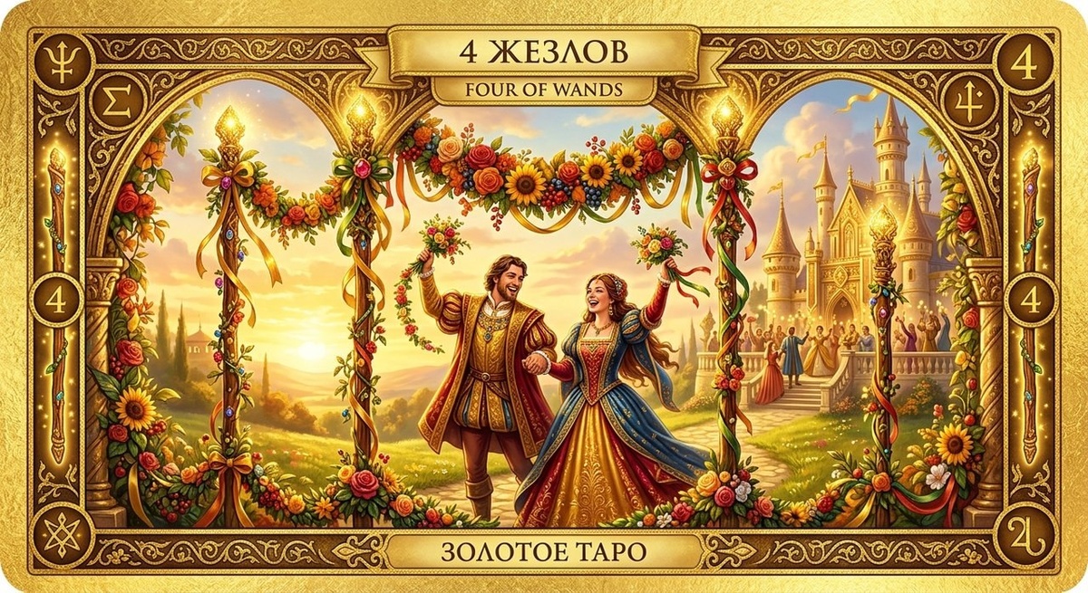 1 минута — и вы почувствуете, что ваш внутренний дом уже построен. 🤍 Поехали! 🚀 Представьте просторный двор или сад. Четыре высоких жезла образуют своеобразные ворота или беседку. Жезлы увиты цветами и фруктами — символами изобилия и плодов вашего труда. Под жезлами — две фигуры (мужчина и женщина) с цветами в руках. Они празднуют. Они не напряжены. Позади — дом или